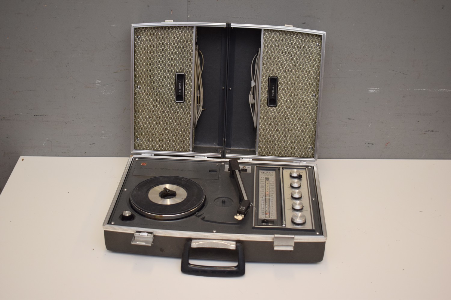 A NATIONAL 1960S PORTABLE RECORD PLAYER/RADIO (A/F) (45W CM) (LEONARD JOEL DELIVERY SIZE: MEDIUM)