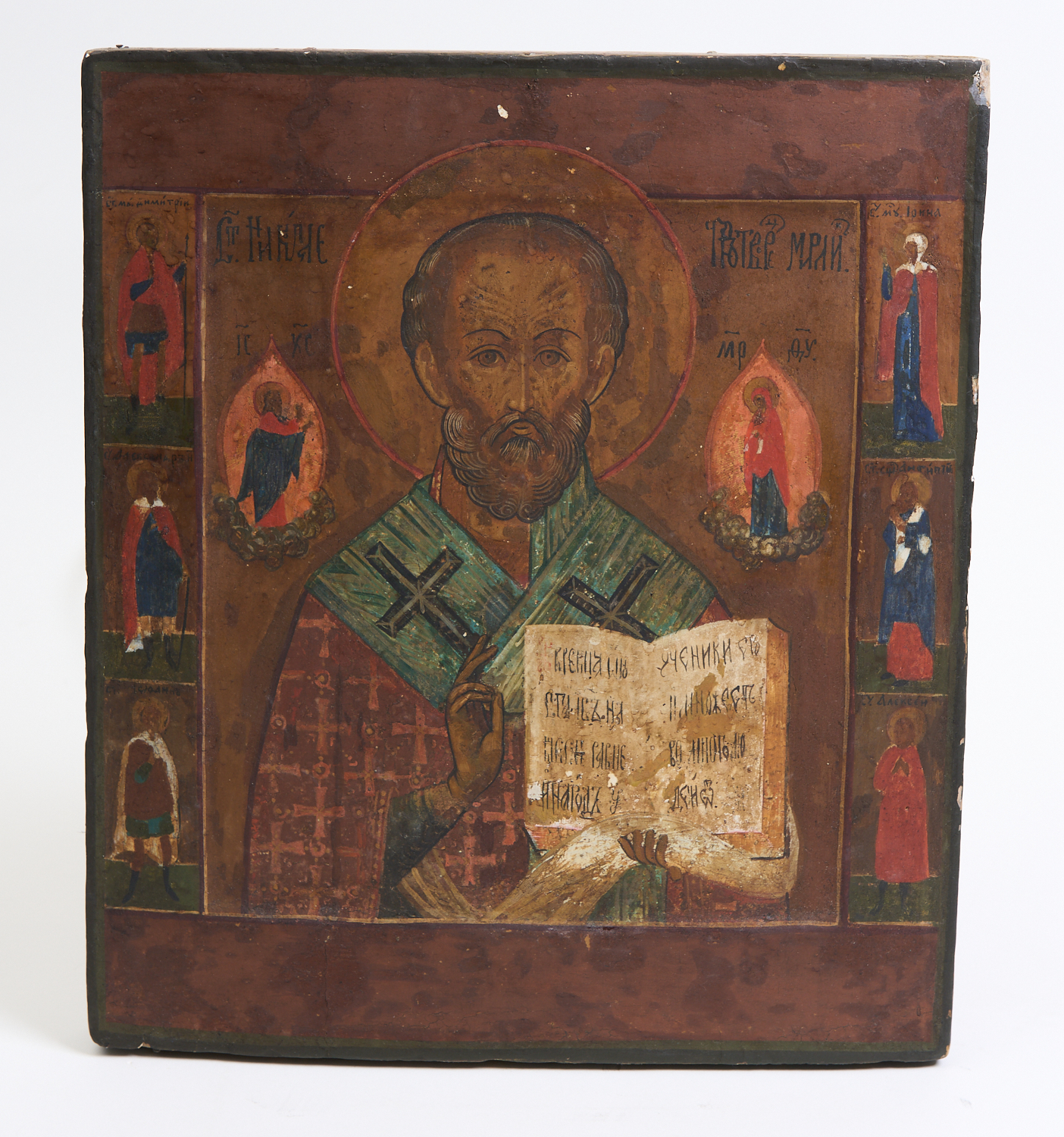 A RUSSIAN ORTHODOX ICON OF ST. NICHOLAS ON WOODEN PANEL (35 CM H), LEONARD JOEL LOCAL DELIVERY SIZE: SMALL