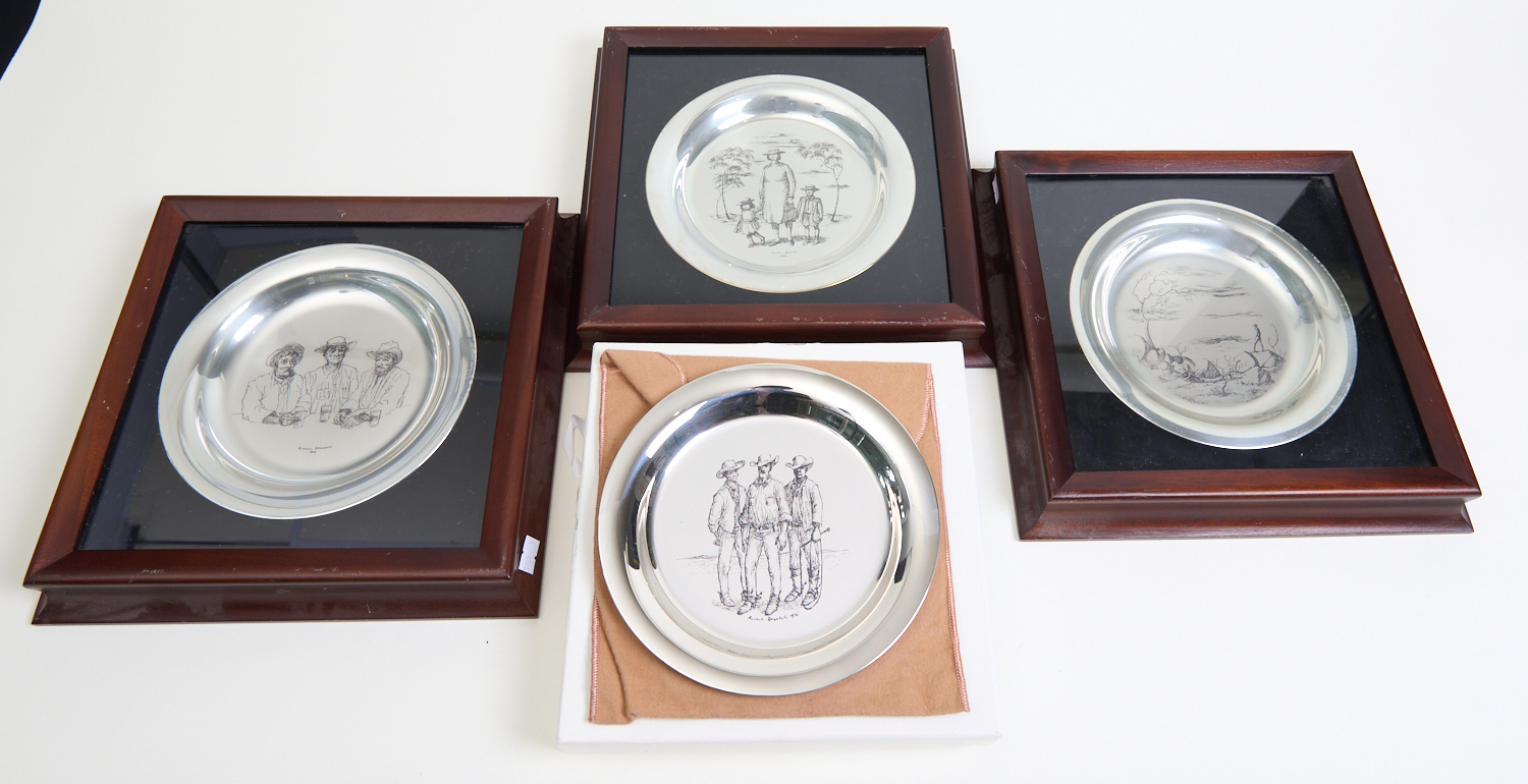 A GROUP OF FOUR RUSSEL DRYSDALE STERLING SILVER ETCHED PLATES BY STOKES TITLED 'THE STOCKMEN', "WESTERN LANDSCAPE', GOING TO TOWN' AND 'OLD TIMERS' WITH ORIGINAL BOXES AND CERTIFICATES OF AUTHENTICITY INCLUDING ONE UNFRAMED, LEONARD JOEL LOCAL DELIVERY SIZE: SMALL