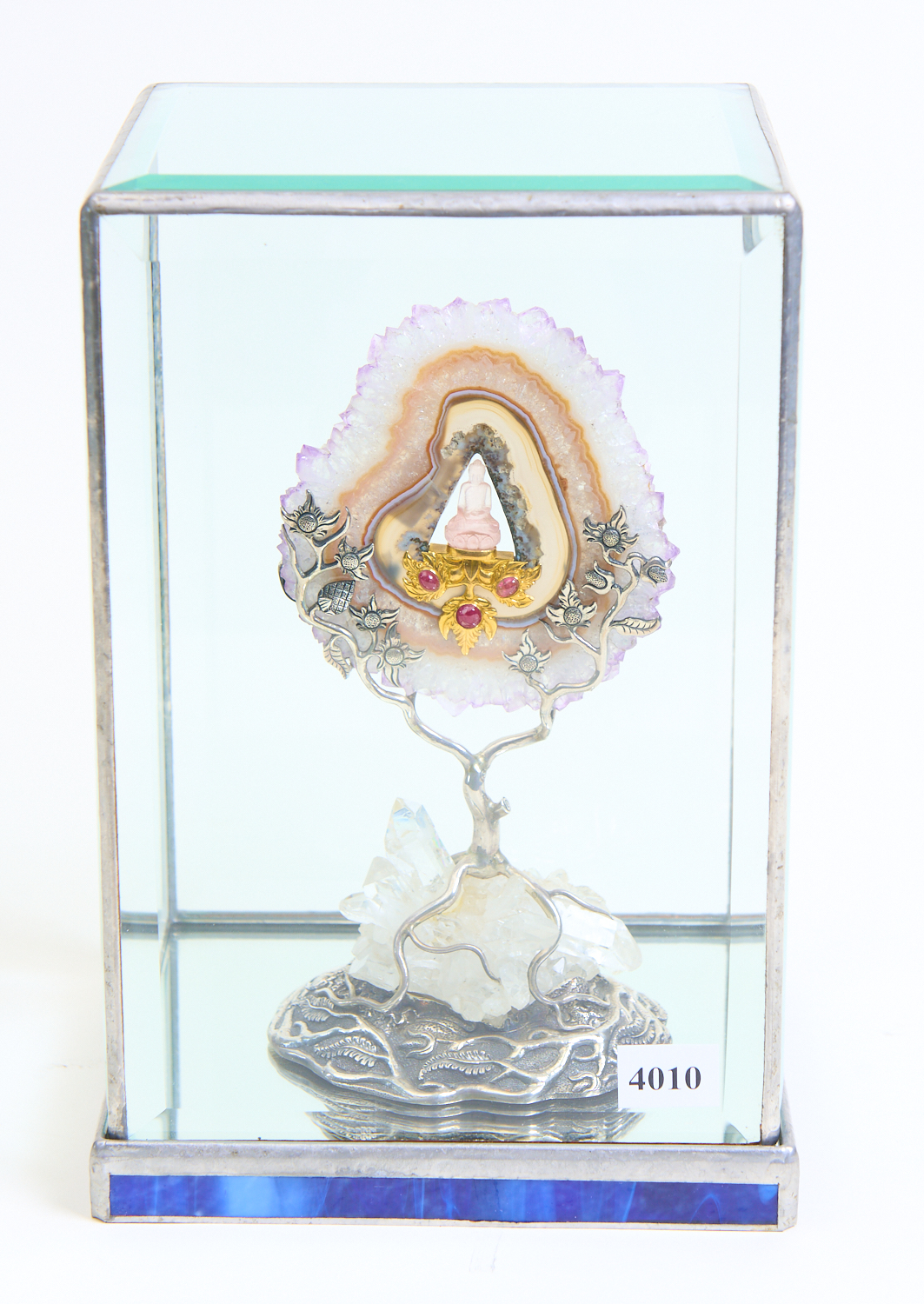 A PINK QUARTZ BUDDHA FIGURE WITH AGATE SURROUND, 22 KT GOLD MOUNT WITH TWO PINK TOURMALINES AND ONE RUBY, 925 SILVER TREE FORM BASE, IN GLASS CASE H.26.5CM, LEONARD JOEL LOCAL DELIVERY SIZE: SMALL