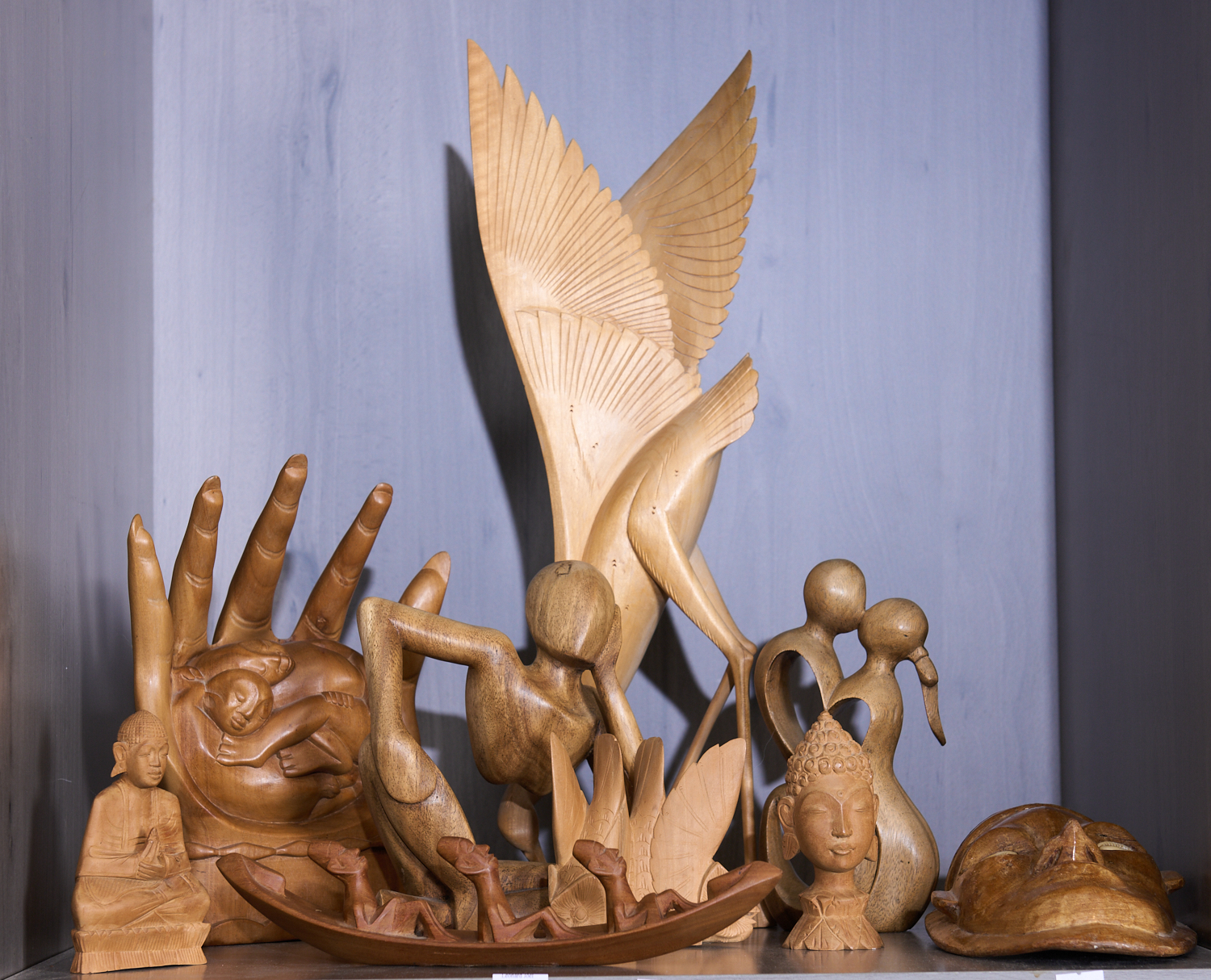 A SHELF LOT OF WOODEN CARVINGS, LEONARD JOEL LOCAL DELIVERY SIZE: SMALL