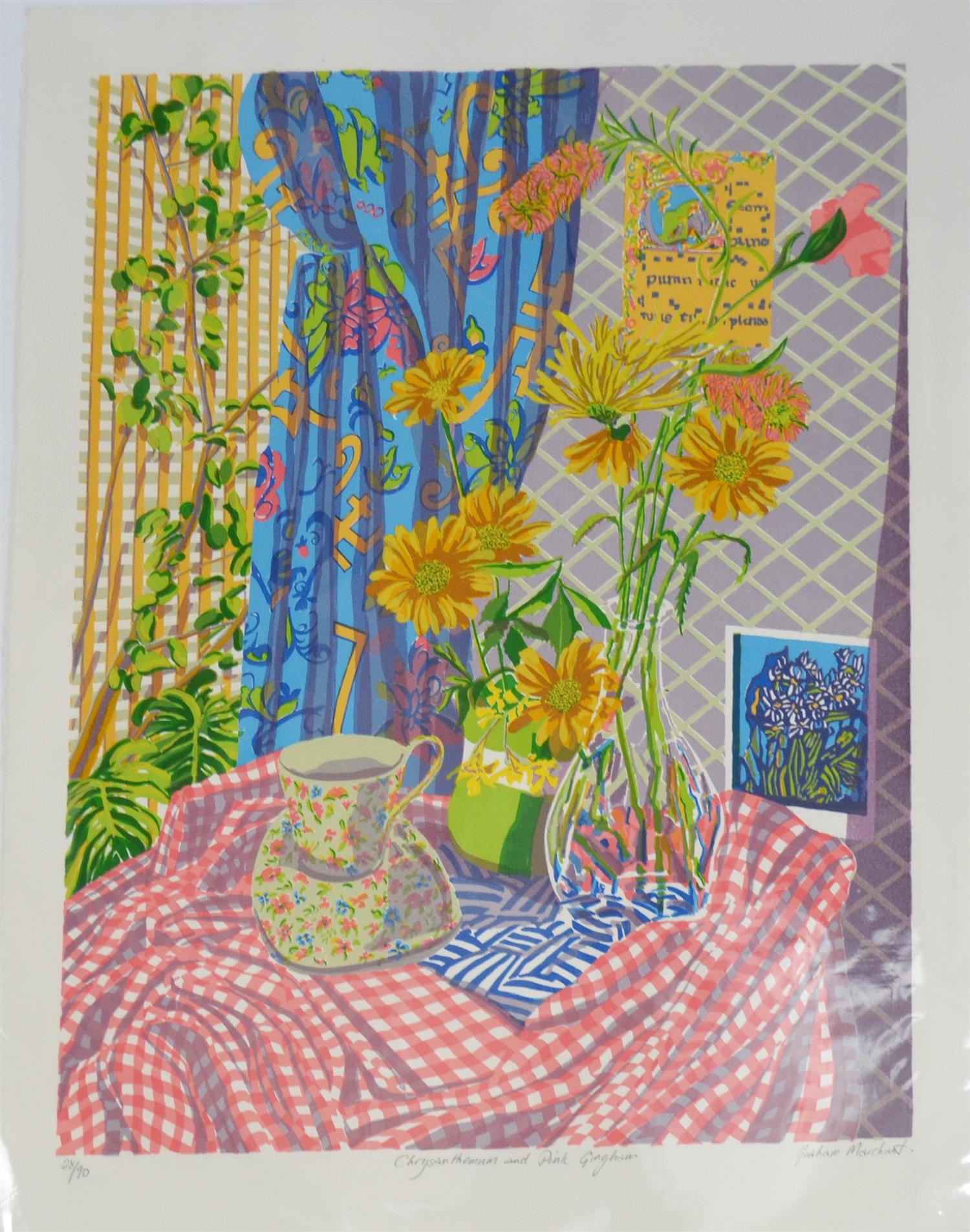 GRAHAM MARCHANT, CHRYSANTHEMUM PINK GINGHAM, SCREENPRINT 28/90, 65 X 48CM, CONDITION: VERY GOOD, THIS WORK IS UNFRAMED HOWEVER BACKED AND WRAPPED IN PLASTIC