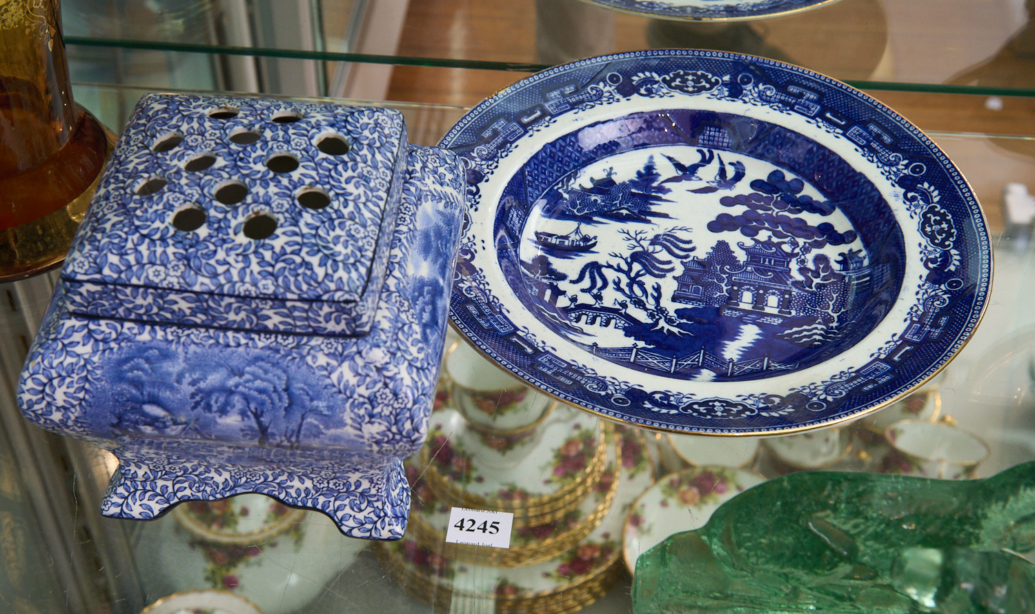 A WILLOW PATTERN PLATE TOGETHER WITH FENTON ROSE BOWL/POT POURRI, LEONARD JOEL LOCAL DELIVERY SIZE: SMALL