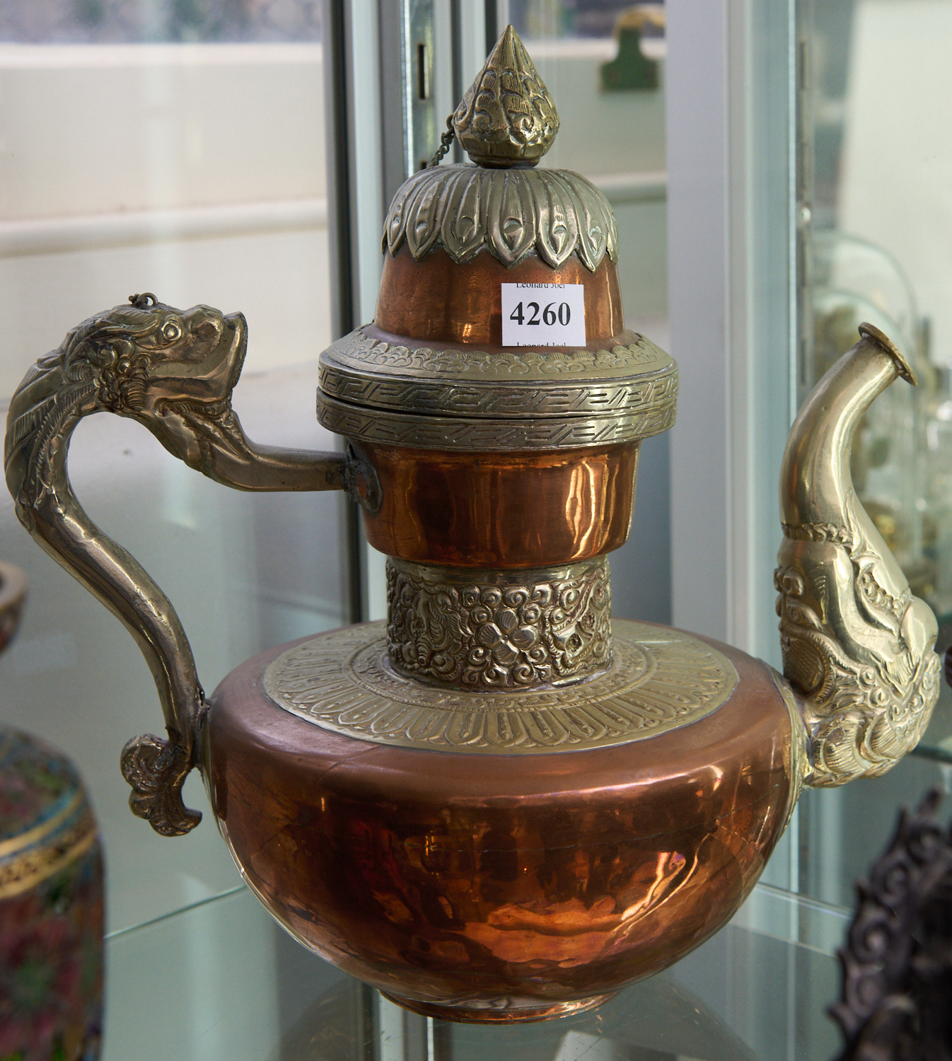 A COPPER AND BRASS TEA POT (30 CM H), LEONARD JOEL LOCAL DELIVERY SIZE: SMALL