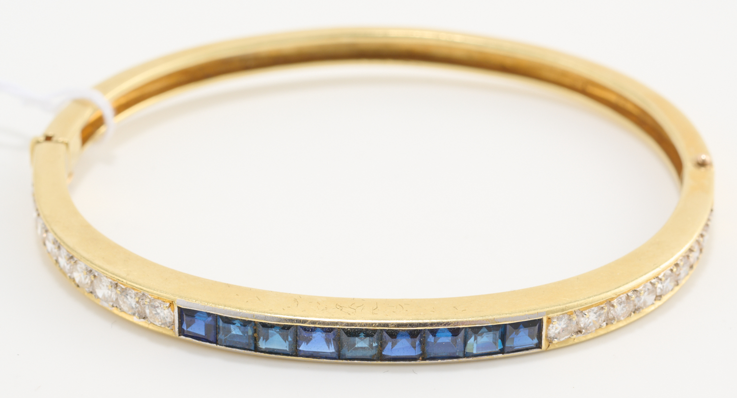 A SAPPHIRE AND DIAMOND BANGLE IN 18CT GOLD, 17.2GMS