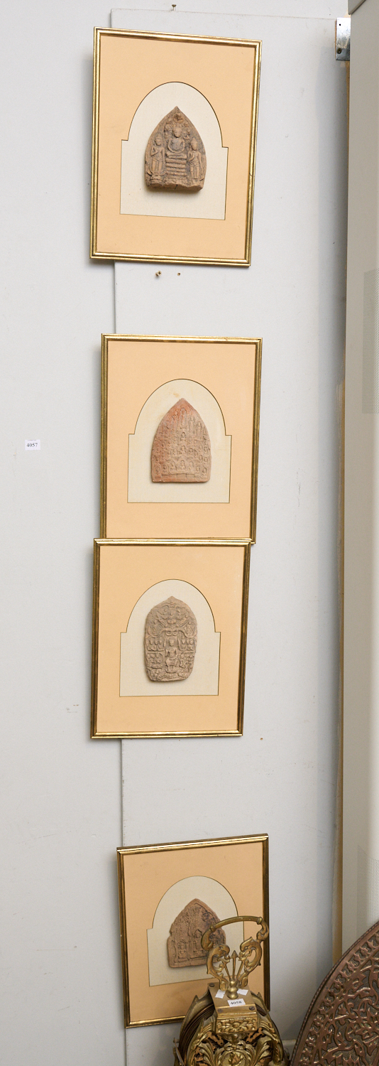 A GROUP OF FOUR BALINESE STONE CARVINGS (FRAMED) (34.5 X 26.5 CM), LEONARD JOEL LOCAL DELIVERY SIZE: SMALL
