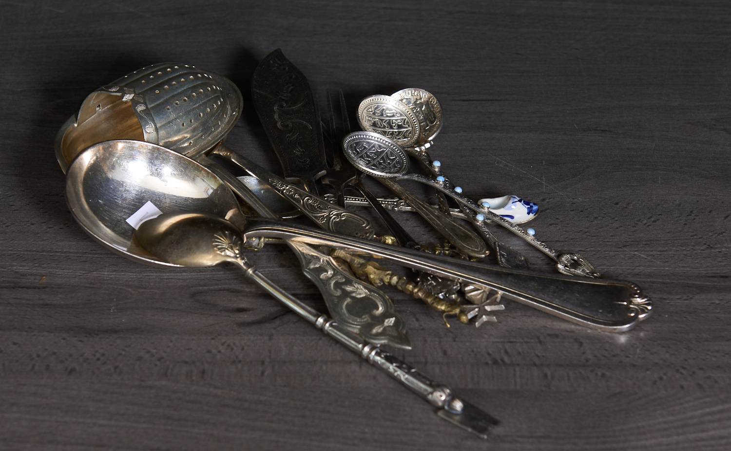 A GROUP OF SILVERPLATE INCLUDING FLATWARE, ETC INCLUDING TEA STRAINER, LEONARD JOEL LOCAL DELIVERY SIZE: SMALL