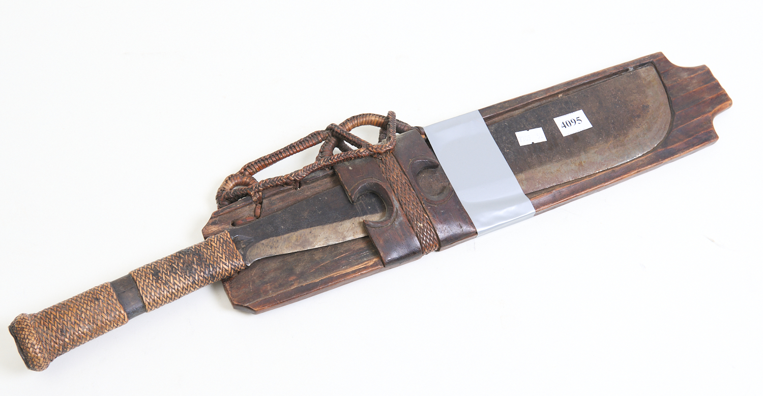 A MACHETE IN WOODEN BLOCK (56 CM H), PLEASE NOTE: VICTORIAN EDGED WEAPONS LICENSE REQUIRED TO PURCHASE, LEONARD JOEL LOCAL DELIVERY SIZE: SMALL