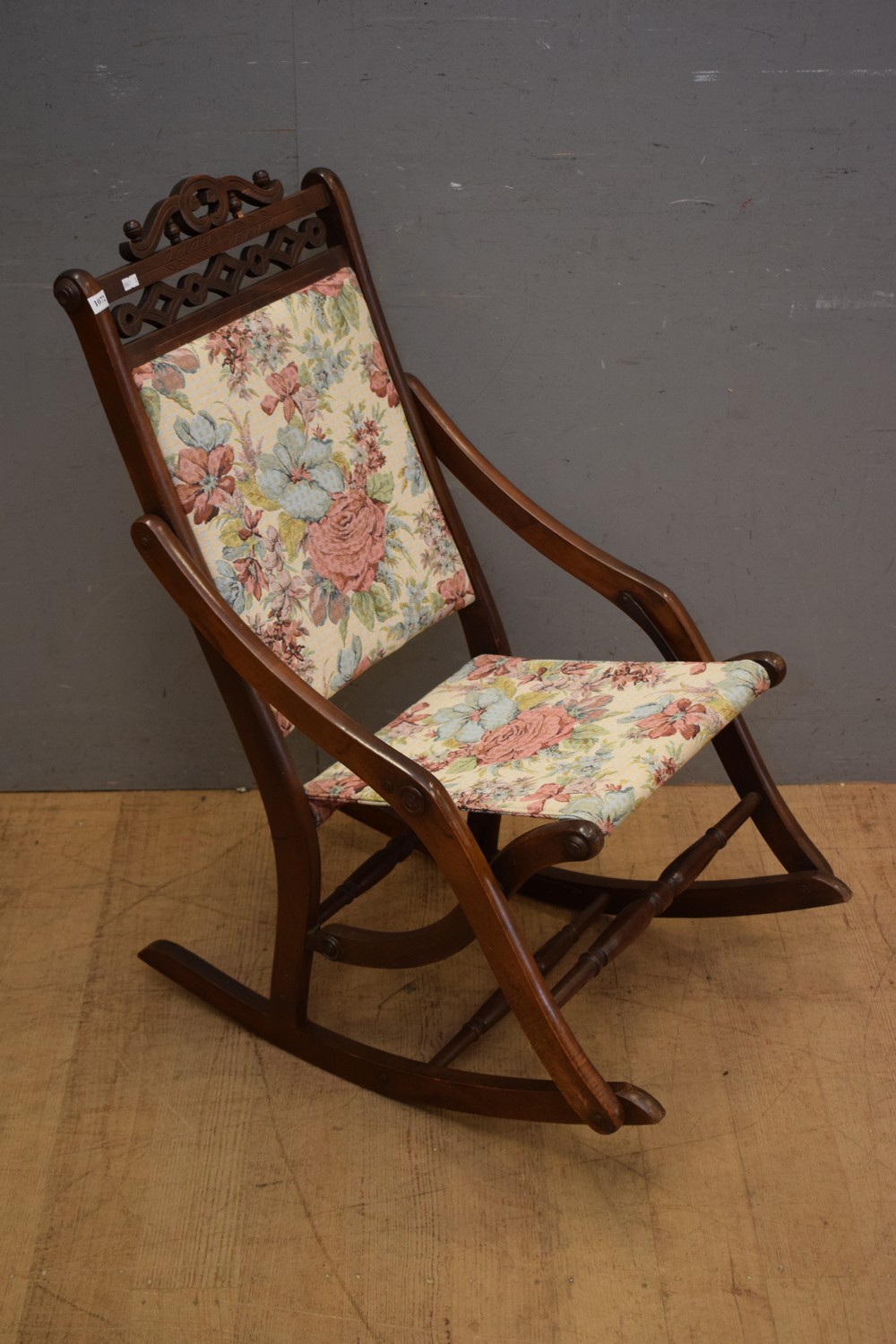 A TIMBER UPHOLSTERED FOLDING ROCKING CHAIR (A/F) (91H x 52W x 64D CM) (LEONARD JOEL DELIVERY SIZE: LARGE)