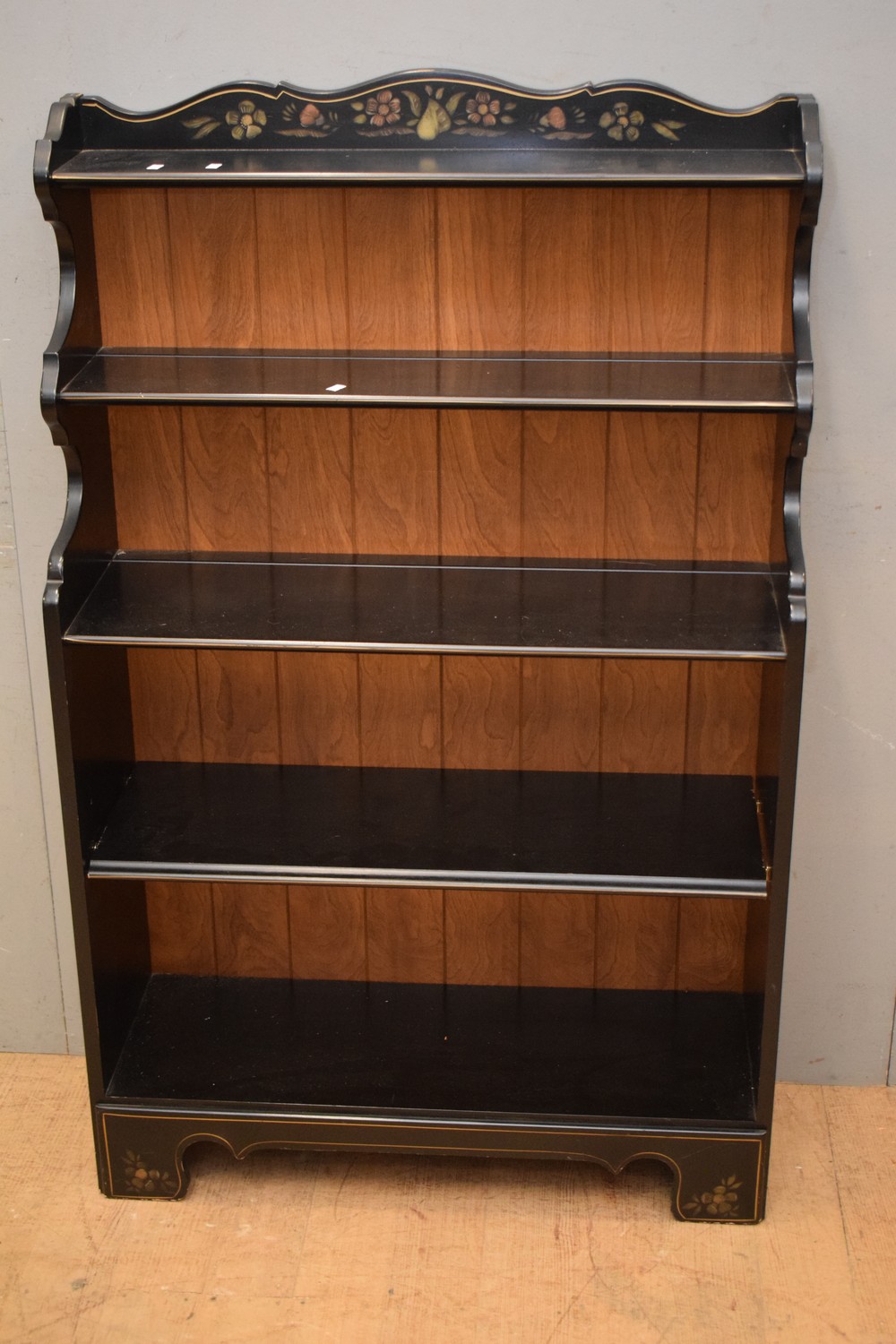 AN EBONISED BOOKSHELF WITH HAND PAINTED DETAILING (A/F) ( 130H X 79W X 29D CM)
