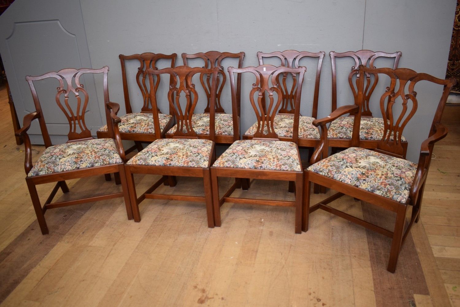 A SET OF EIGHT CHIPPENDALE STYLE DINING CHAIRS ( 96H X 67W X 60D CM) (PLEASE NOTE THIS HEAVY ITEM MUST BE REMOVED BY CARRIERS AT THE CUSTOMER'S EXPENSE. LEONARD JOEL STAFF CANNOT ASSIST CARRYING THIS ITEM) (X-LARGE ITEM)