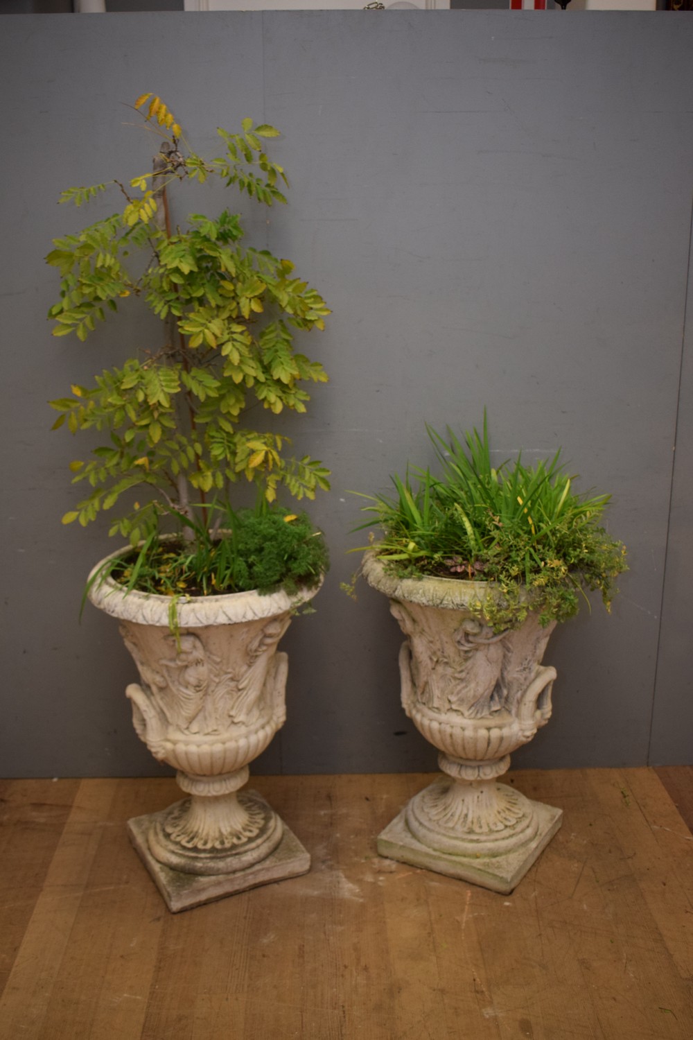 A PAIR OF SUBSTANTIAL CLASSICAL STYLE URNS (A/F) (180H x 64D CM) (PLEASE NOTE THIS HEAVY ITEM MUST BE REMOVED BY CARRIERS AT THE CUSTOMER'S EXPENSE. LEONARD JOEL STAFF CANNOT ASSIST CARRYING THIS ITEM) (X-LARGE ITEM)