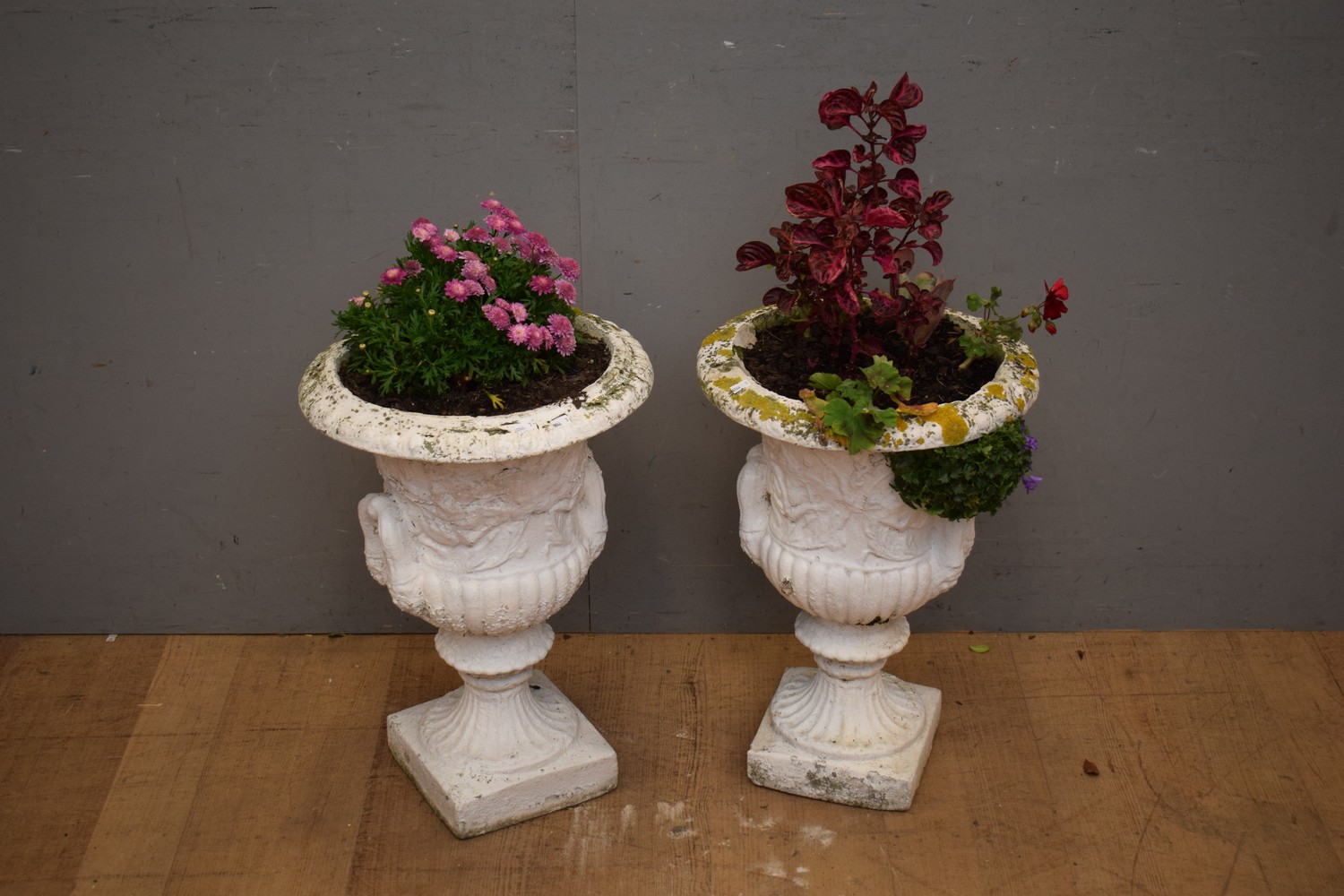 A PAIR OF PAINTED CONCRETE CLASSICAL STYLE URNS (59H x 38D CM) (PLEASE NOTE THIS HEAVY ITEM MUST BE REMOVED BY CARRIERS AT THE CUSTOMER'S EXPENSE. LEONARD JOEL STAFF CANNOT ASSIST CARRYING THIS ITEM) (X-LARGE ITEM)