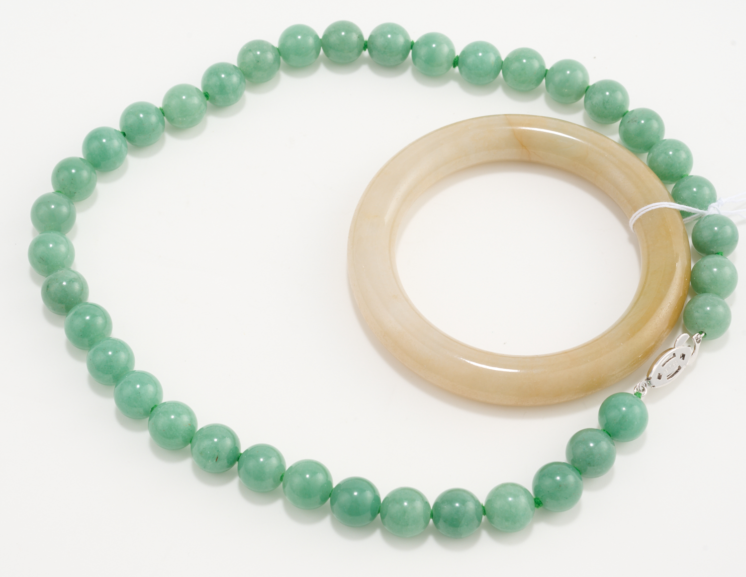 JADE BANGLE DIAMETER APPROXIMATELY 55MM AND GREEN HARDSTONE NECKLACE, LENGTH 43CM