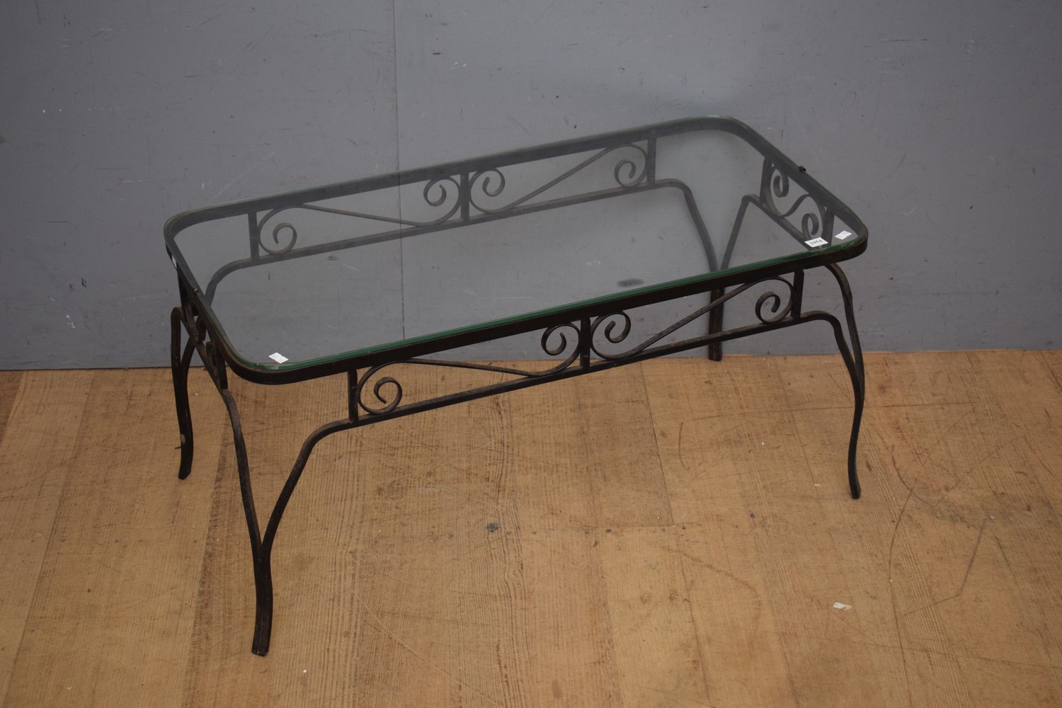 A 1940S WROUGHT IRON GLASS TOPPED COFFEE TABLE (CHIP TO GLASS) (42H x 87W x 44D CM) (LEONARD JOEL DELIVERY SIZE: LARGE)