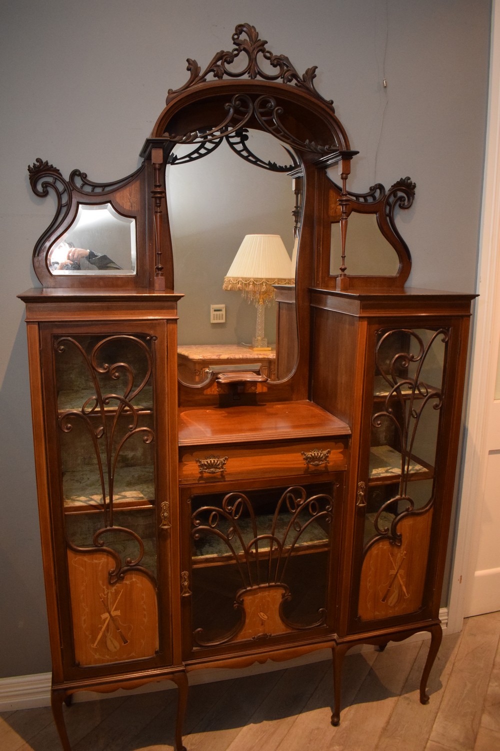 AN ART NOUVEAU INLAID GLAZED DISPLAY CABINET BY SHAPLAND AND PETTER (A/F) (235H X 137W X 47D CM) (PLEASE NOTE THIS HEAVY ITEM MUST BE REMOVED BY CARRIERS AT THE CUSTOMER'S EXPENSE. LEONARD JOEL STAFF CANNOT ASSIST CARRYING THIS ITEM) (X-LARGE ITEM)