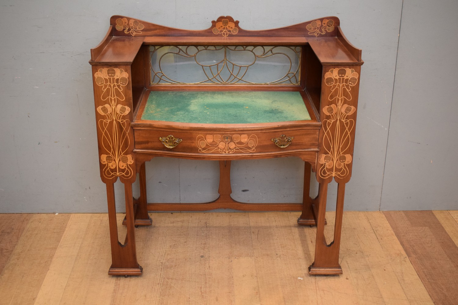 AN ART NOUVEAU WRITING DESK WITH LEADLIGHT BACK BY SHAPLAND & PETTER (A/F) (111H x 110W x 56D CM) (PLEASE NOTE THIS HEAVY ITEM MUST BE REMOVED BY CARRIERS AT THE CUSTOMER'S EXPENSE. LEONARD JOEL STAFF CANNOT ASSIST CARRYING THIS ITEM) (X-LARGE ITEM)