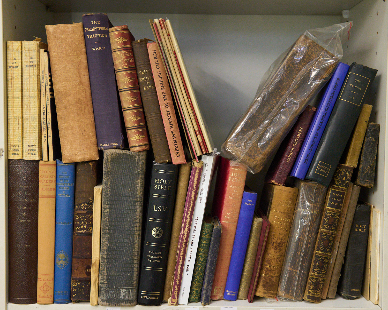 A SHELF OF BOOKS PERTAINING MOSTLY TO RELIGION INCLUDING MERCHANT SEAMAN'S BIBLE, ETC, LEONARD JOEL LOCAL DELIVERY SIZE: SMALL. The Rodney Permezel Collection