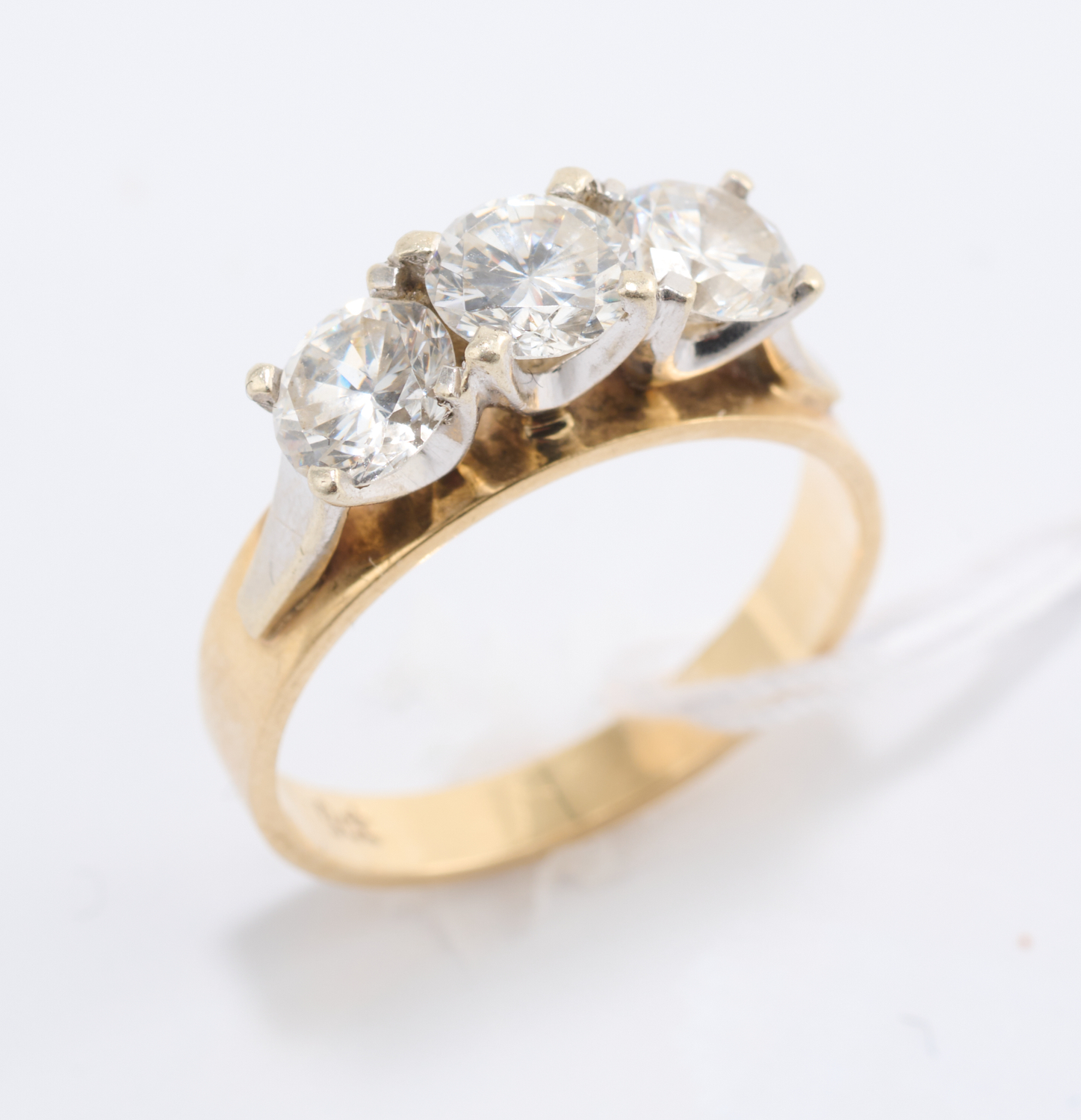 A THREE DIAMOND IMITATION CLEAR STONE SET RING IN 9CT GOLD, SIZE L, WEIGHT 3.5GMS