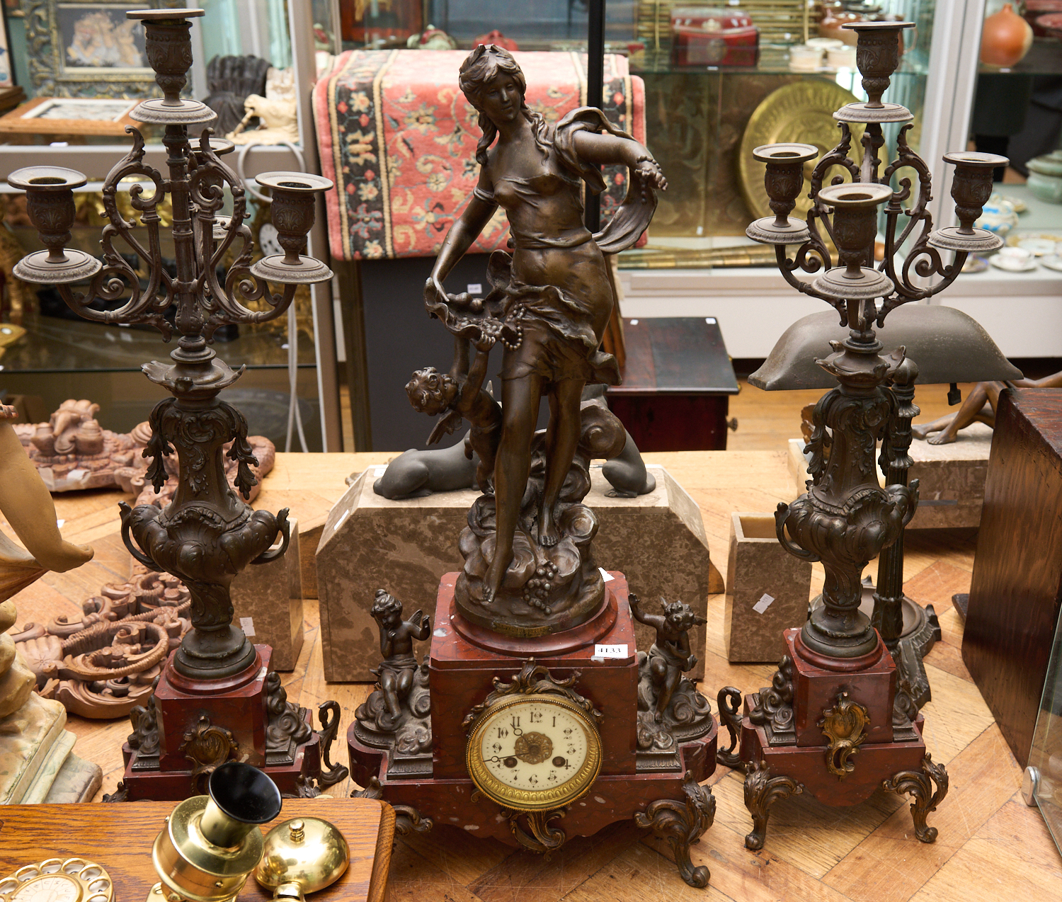 A THREE PIECE MARBLE AND SPELTER CLOCK GARNITURE (A/F) H.65CM , LEONARD JOEL LOCAL DELIVERY SIZE: SMALL