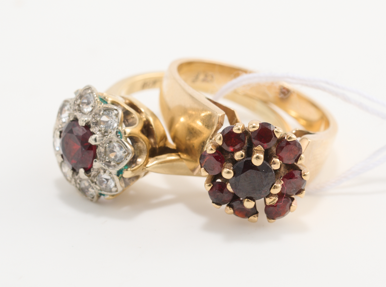 TWO GOLD AND GEM-SET CLUSTER RINGS, SIZE L 1/2 AND J 1/2, BOTH IN 9CT GOLD, TOTAL WEIGHT 8GMS