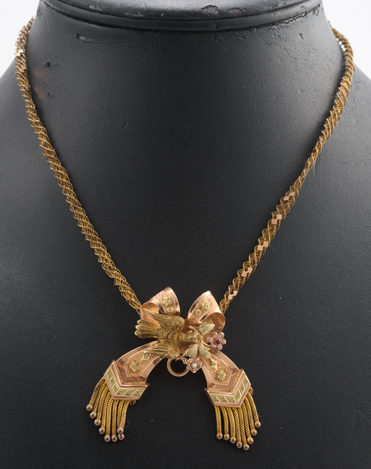 AN ITALIAN TRI-COLOUR GOLD BOW PENDANT NECKLACE IN LOW CARAT GOLD, LENGTH APPROXIMATELY 400MM