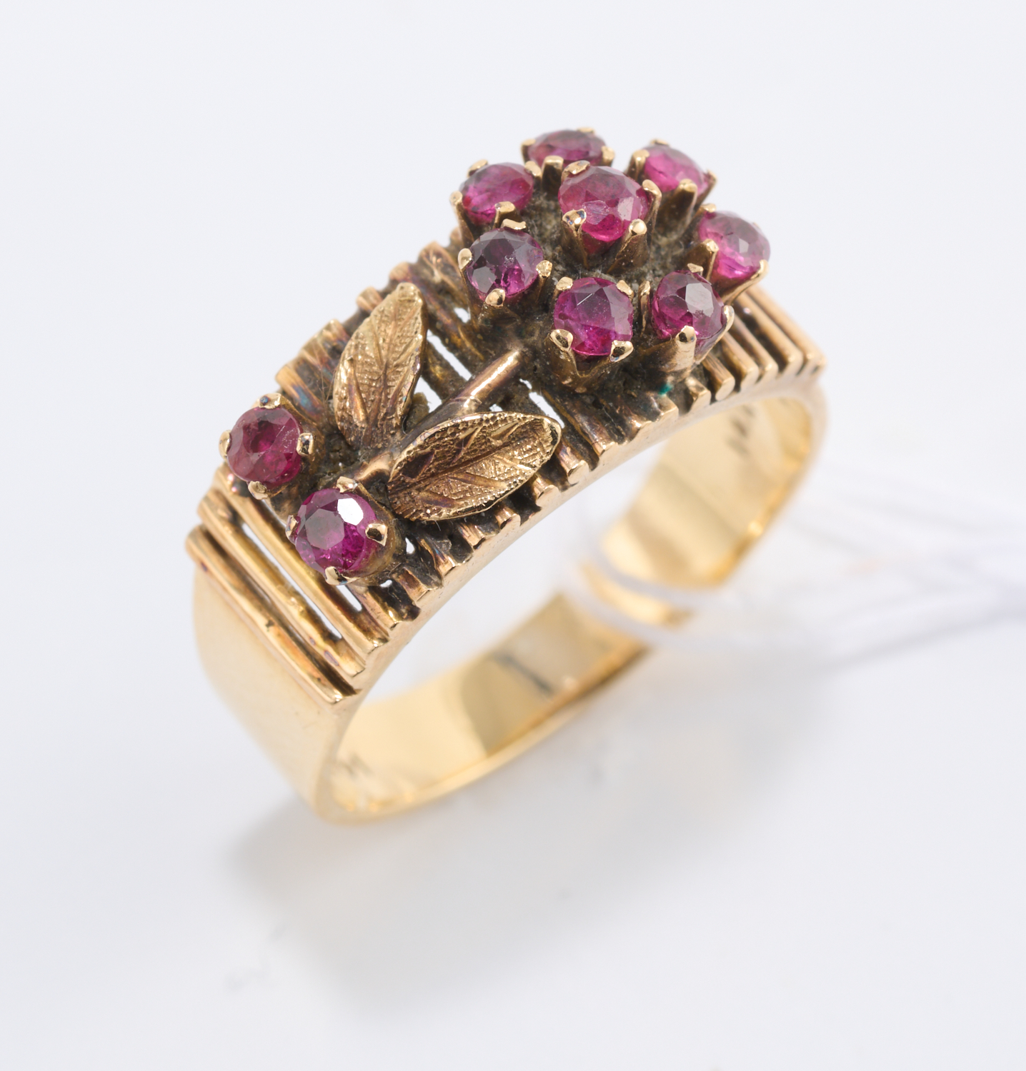 A RIBBED RUBY SET FLOWER-STEAM RING IN 14CT GOLD, RING SIZE M/N, 4.7GMS