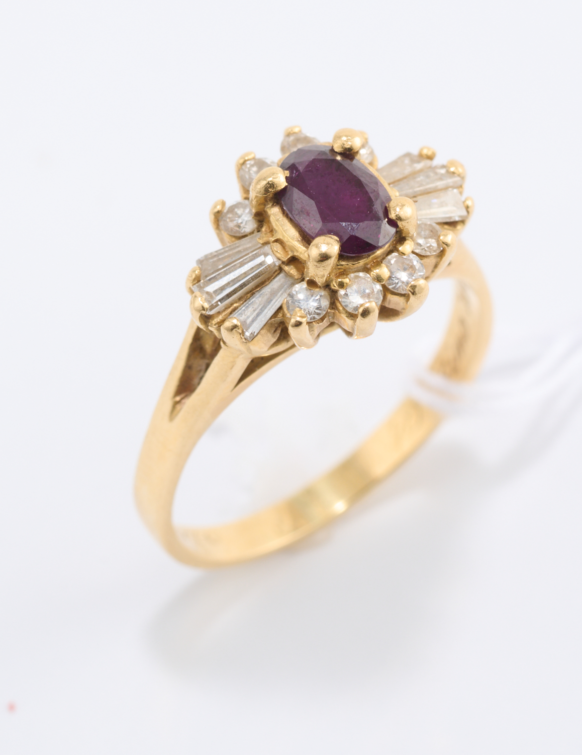 A RUBY AND DIAMOND RING IN 18CT GOLD, RING SIZE M/N, 4.1GMS