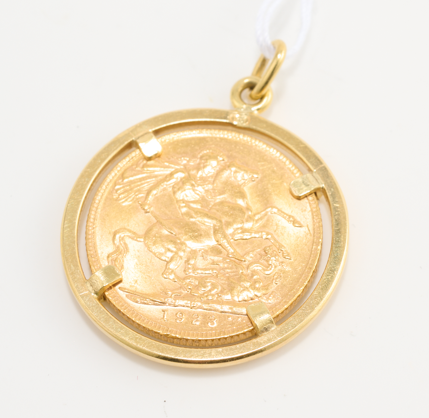 A 1923 FRAMED GOLD SOVEREIGN PENDANT, FRAME 18CT GOLD, COIN 21 CT GOLD, TOTAL WEIGHT 11.7GMS