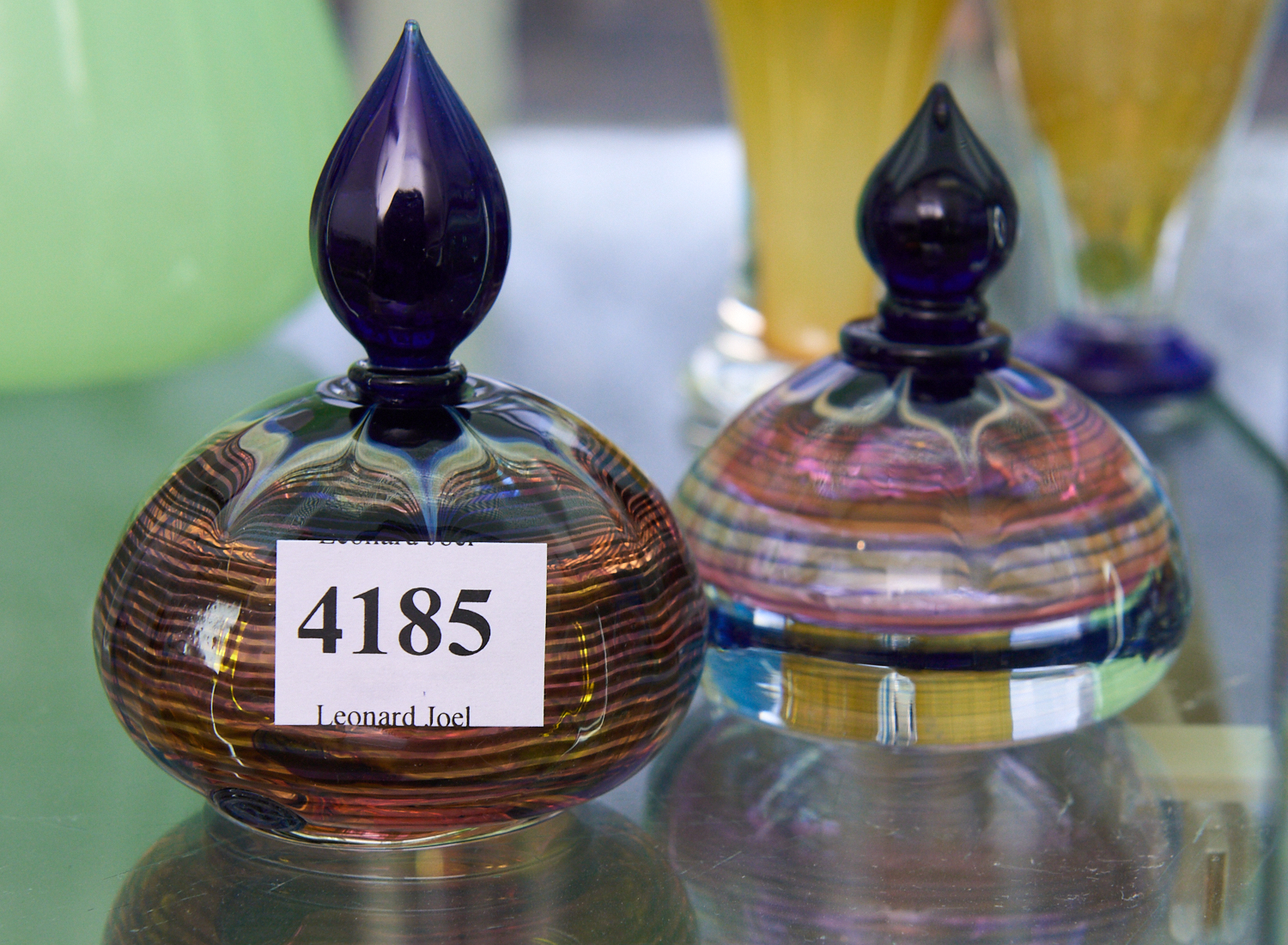 TWO RICHARD CLEMENTS ART GLASS PERFUME BOTTLES IN SHADES OF BLUE AND PINK WITH STRIPED DECORATION, TALLEST H.7.5CM, LEONARD JOEL LOCAL DELIVERY SIZE: SMALL