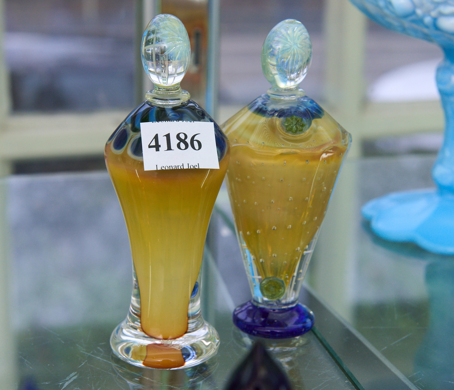TWO RICHARD CLEMENTS ART GLASS PERFUME BOTTLES IN SHADES OF YELLOW AND BLUE WITH ROUND STOPPERS, TALLEST H.12.5CM, LEONARD JOEL LOCAL DELIVERY SIZE: SMALL
