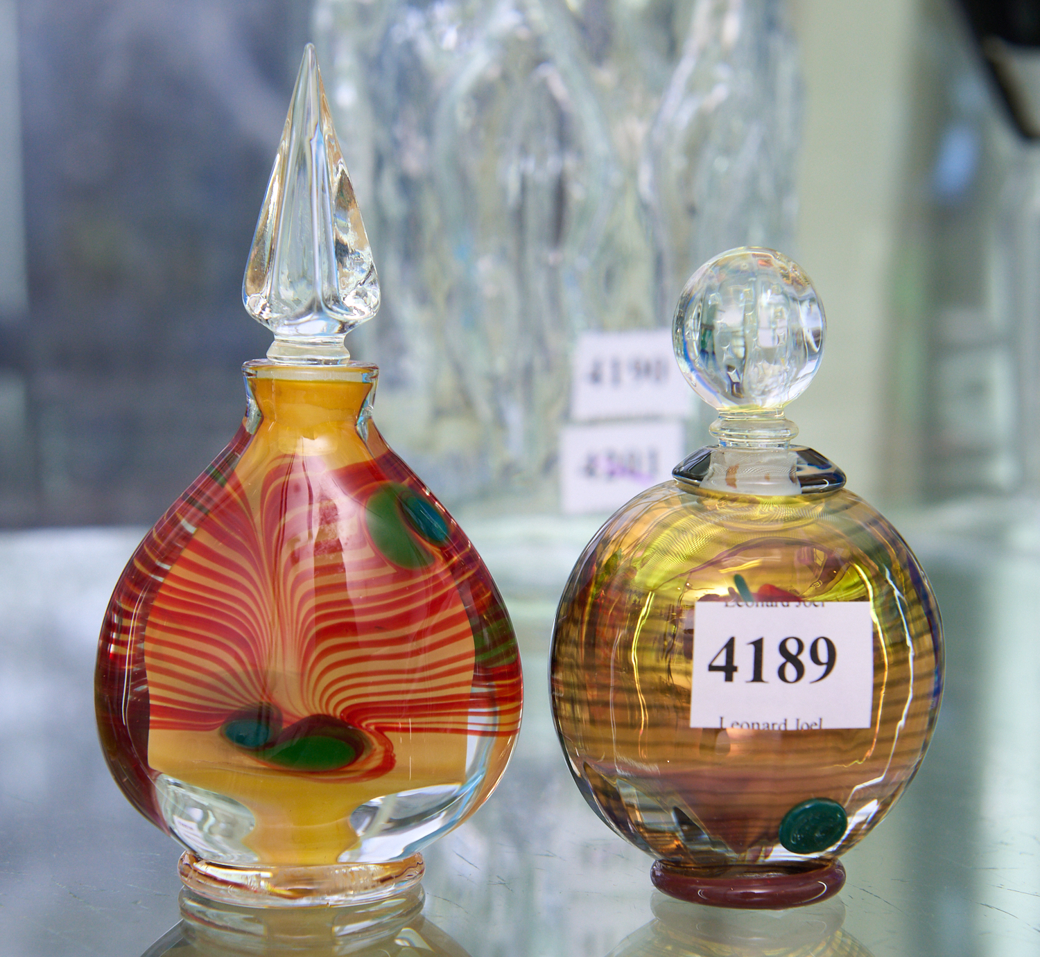 TWO RICHARD CLEMENTS ART GLASS PERFUME BOTTLES WITH STRIPED DECORATION, TALLEST H.14CM, LEONARD JOEL LOCAL DELIVERY SIZE: SMALL