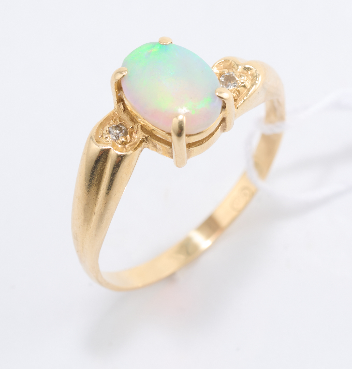AN OPAL AND DIAMOND RING IN 14CT GOLD, RING SIZE O/P, 2.5GMS