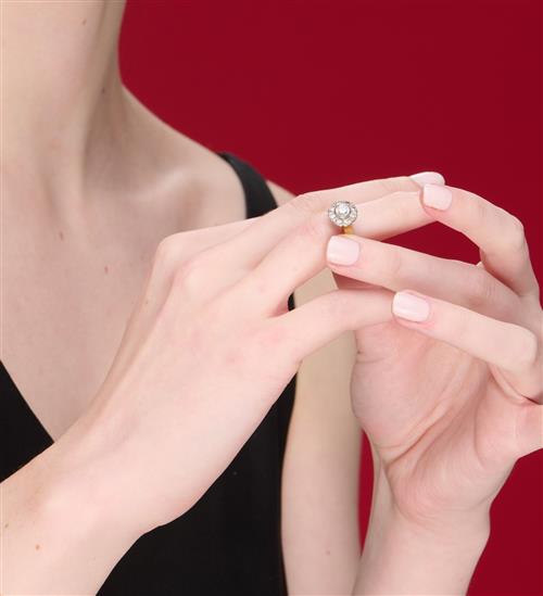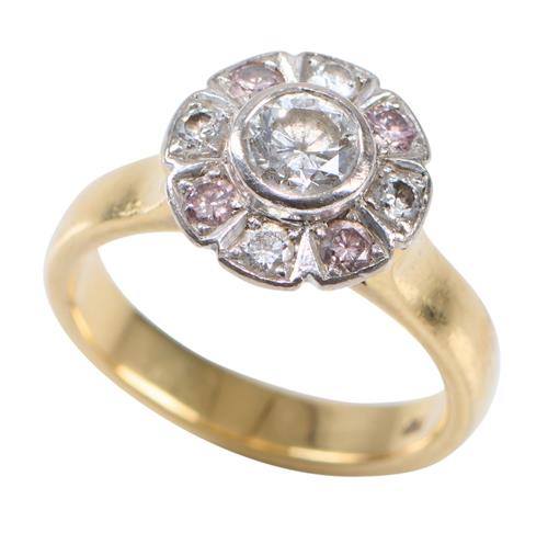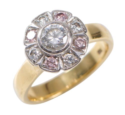A PINK DIAMOND AND DIAMOND RING IN 18CT TWO TONE GOLD, OF CLUSTER DESIGN, CENTRING A ROUND BRILLIANT-CUT DIAMOND WEIGHING APPROXIMATELY 0.40 CARATS, WITHIN A SURROUND OF FOUR BRILLIANT-CUT PINK DIAMONDS AND FOUR BRILLIANT-CUT DIAMONDS TOGETHER WEIGHING APPROXIMATELY 0.36 CARATS, RING SIZE H