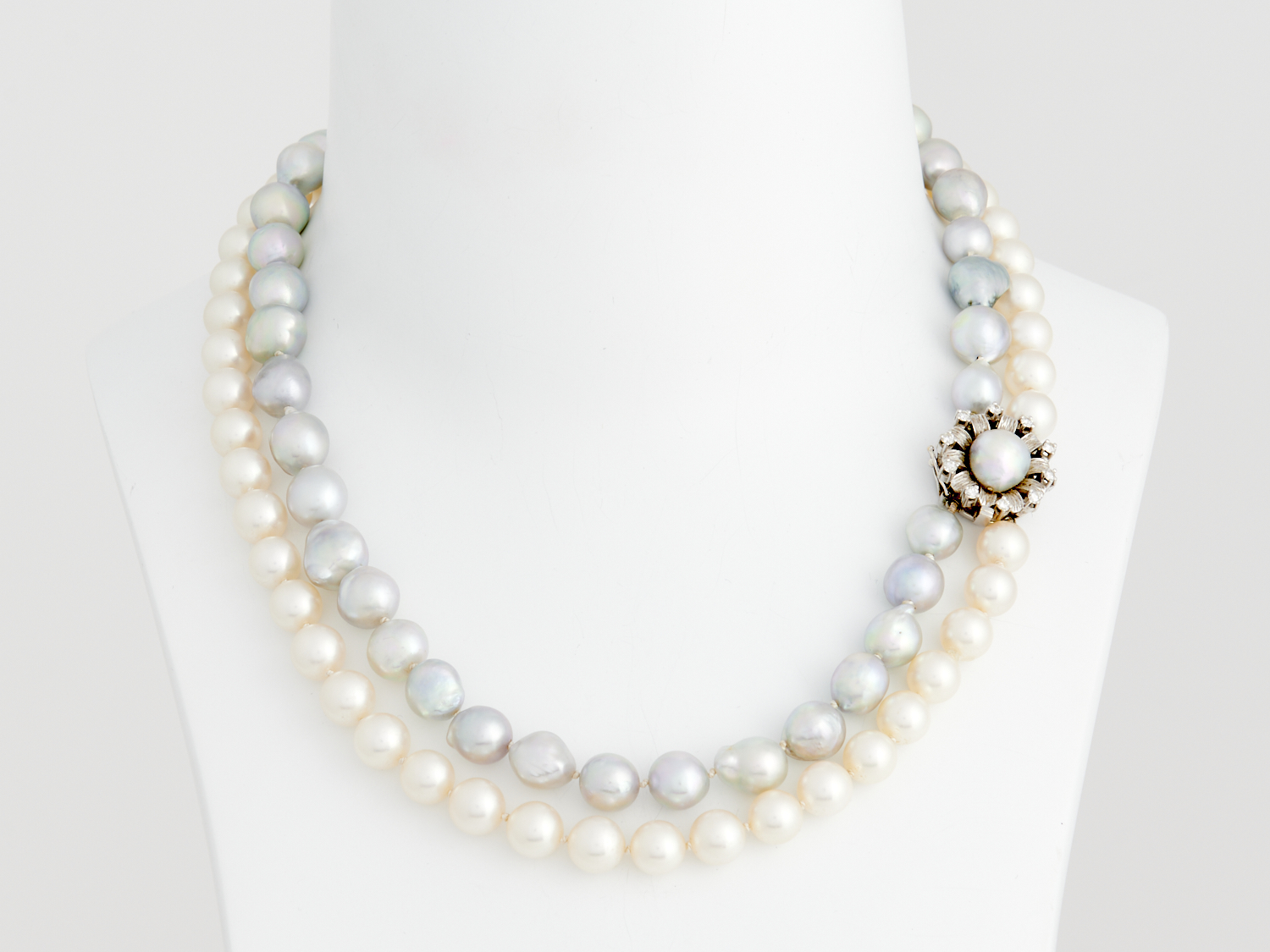 A DOUBLE STRAND OF CULTURED AND BAROQUE PEARLS TO A PEARL AND DIAMOND SET CLASP IN 14CT WHITE GOLD, 460MM
