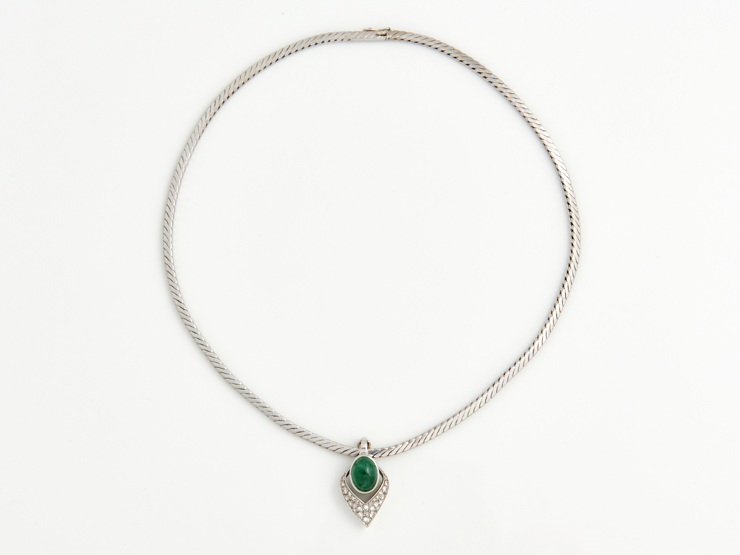 AN EMERALD AND DIAMOND ENHANCER IN 9CT WHITE GOLD, TO A SNAKE LINK CHAIN IN 18CT WHITE GOLD, THE EMERALD OF 2.7CTS, THE DIAMONDS TOTALLING 0.5CTS, 400MM, TOTAL WEIGHT 31.9GMS