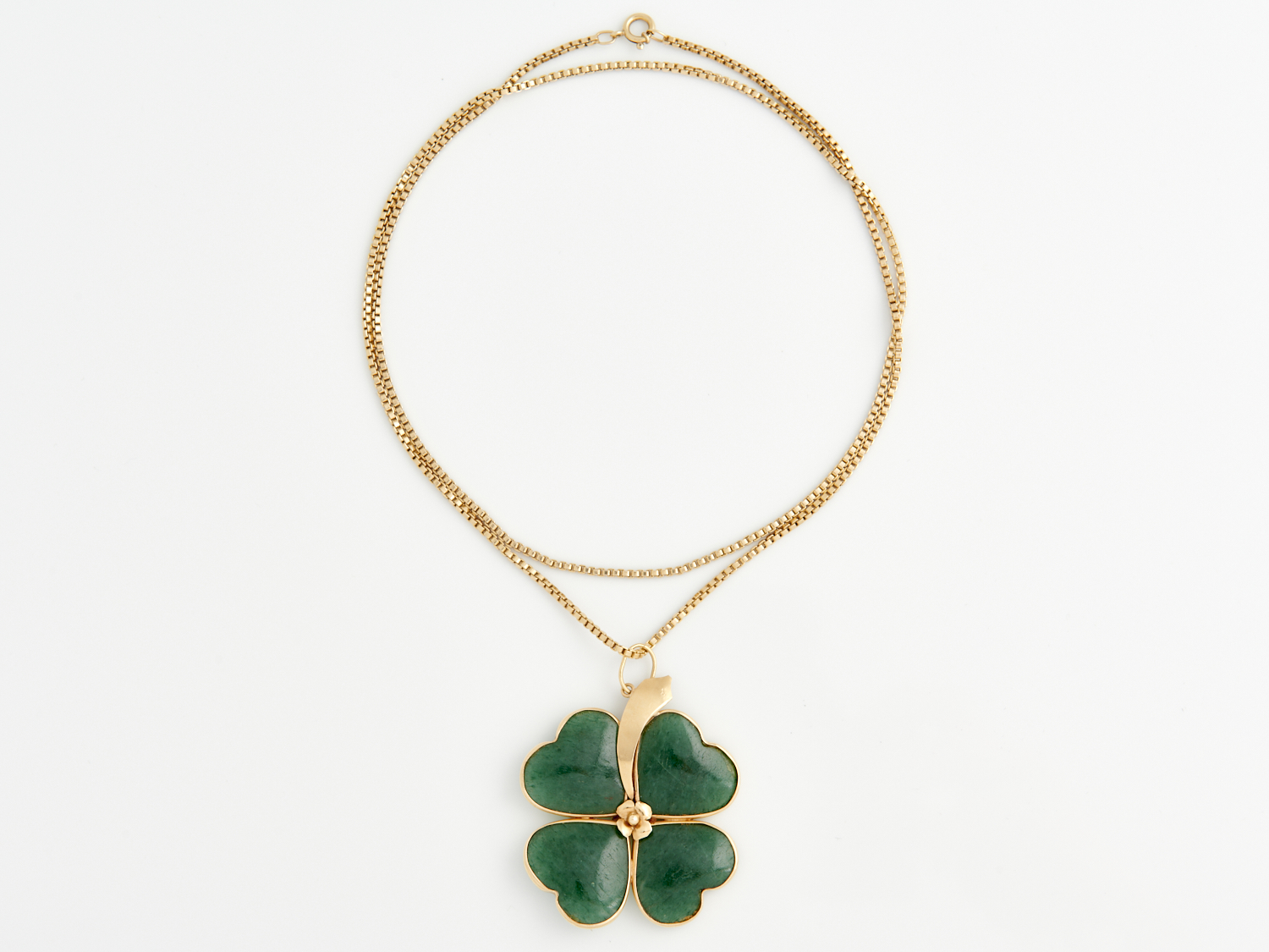 A NEPHRITE FOUR LEAF CLOVER PENDANT IN 18CT GOLD, TO A BOX LINK CHAIN IN 14CT GOLD, THE CHAIN 710MM. THE PENDANT 55 X 50MM, TOTAL WEIGHT 32.4GMS