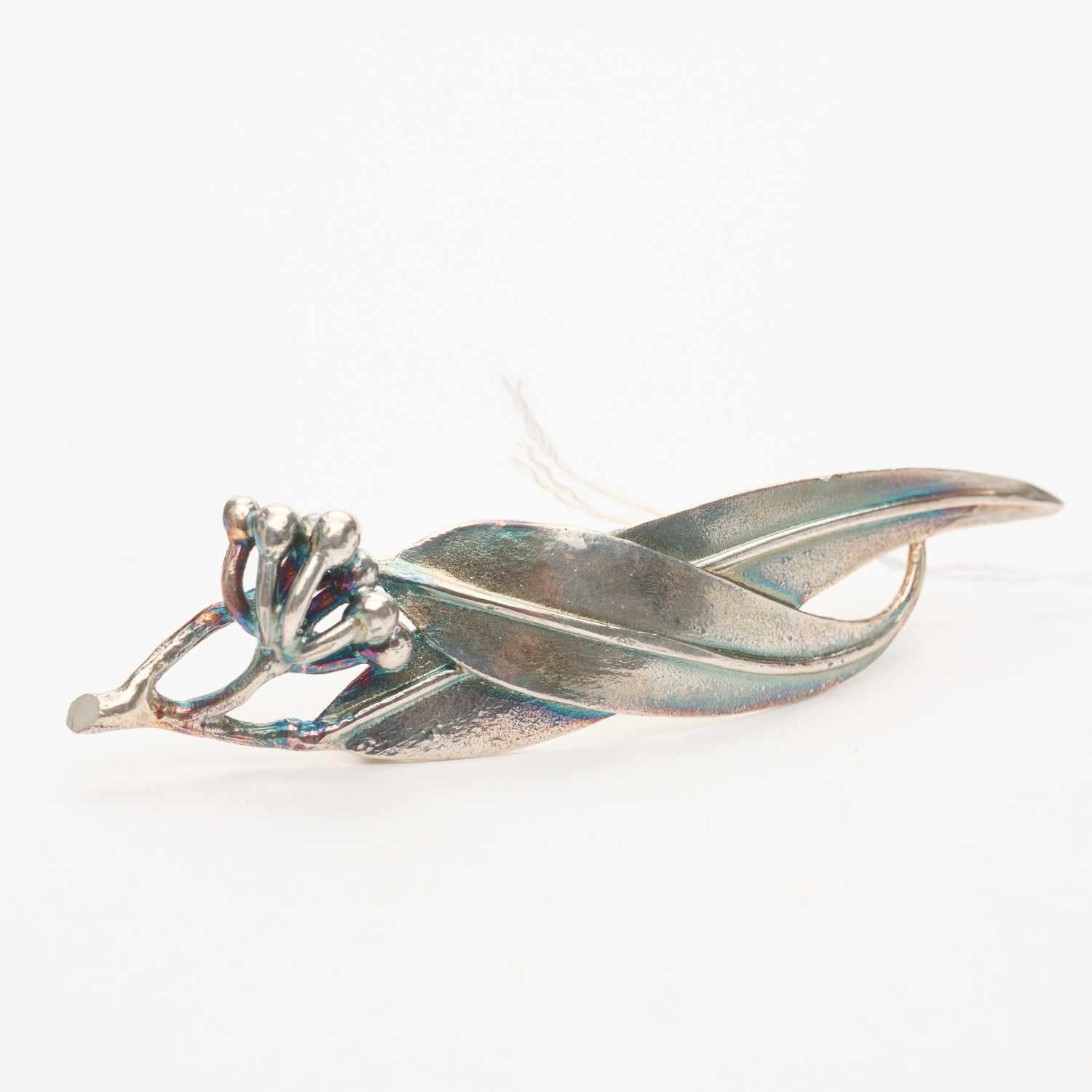 A LARGE GUM LEAF BROOCH IN SILVER BY TONY KEAN, 72 X 14MM