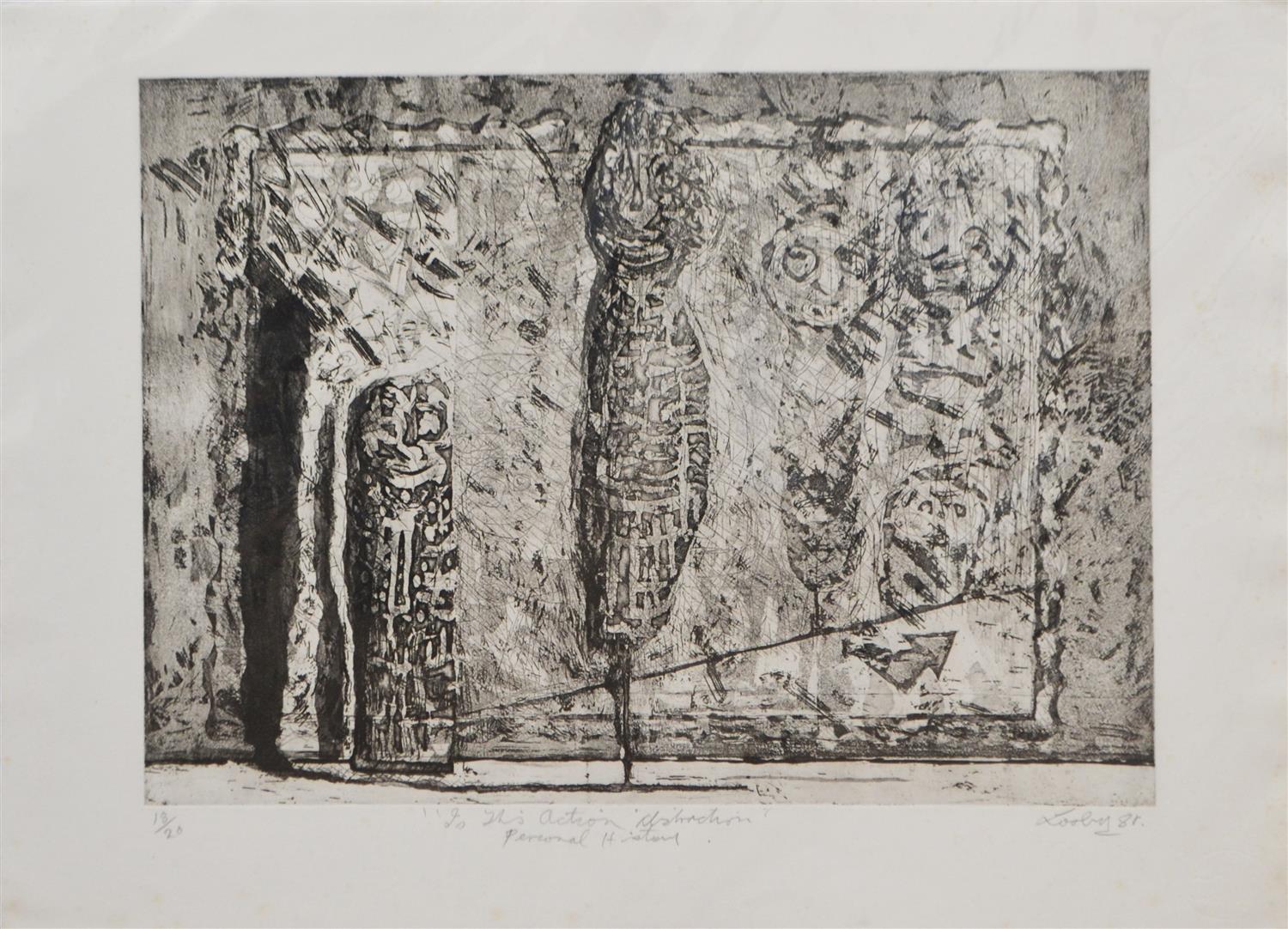 KEITH LOOBY, TO THIS ACTION DISTRACTION PERSONAL HISTORY 1988, ETCHING 18/20, 43.5 X 59CM