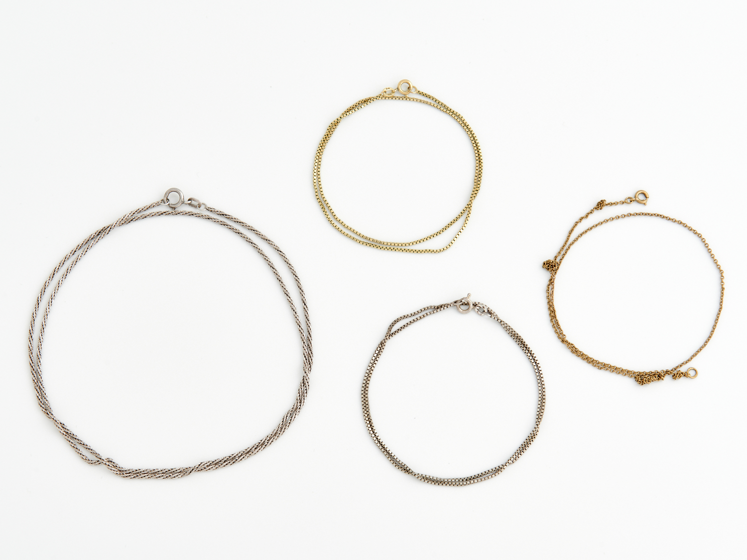 A COLLECTION OF FOUR CHAINS IN SILVER AND LOW CARAT GOLD