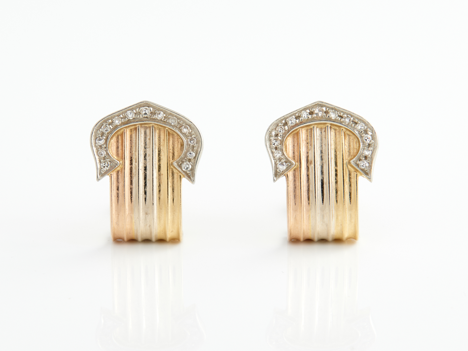 A PAIR OF DIAMOND EARRINGS IN 14CT TRI COLOUR GOLD, TO POST AND LEVER BACK FITTINGS, 20MM, 8.18GMS