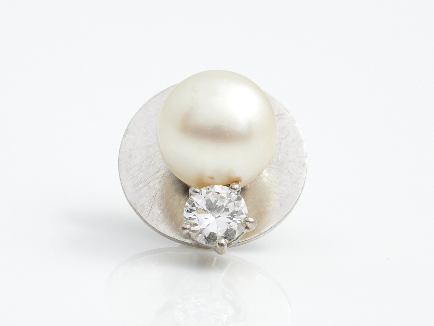 A CULTURED PEARL AND DIAMOND STUD EARRING IN 14CT AND 18CT WHITE GOLD, TO POST AND BUTTERFLY FITTING, THE PEARL MEASURING 9MM, THE DIAMOND OF 0.35CTS