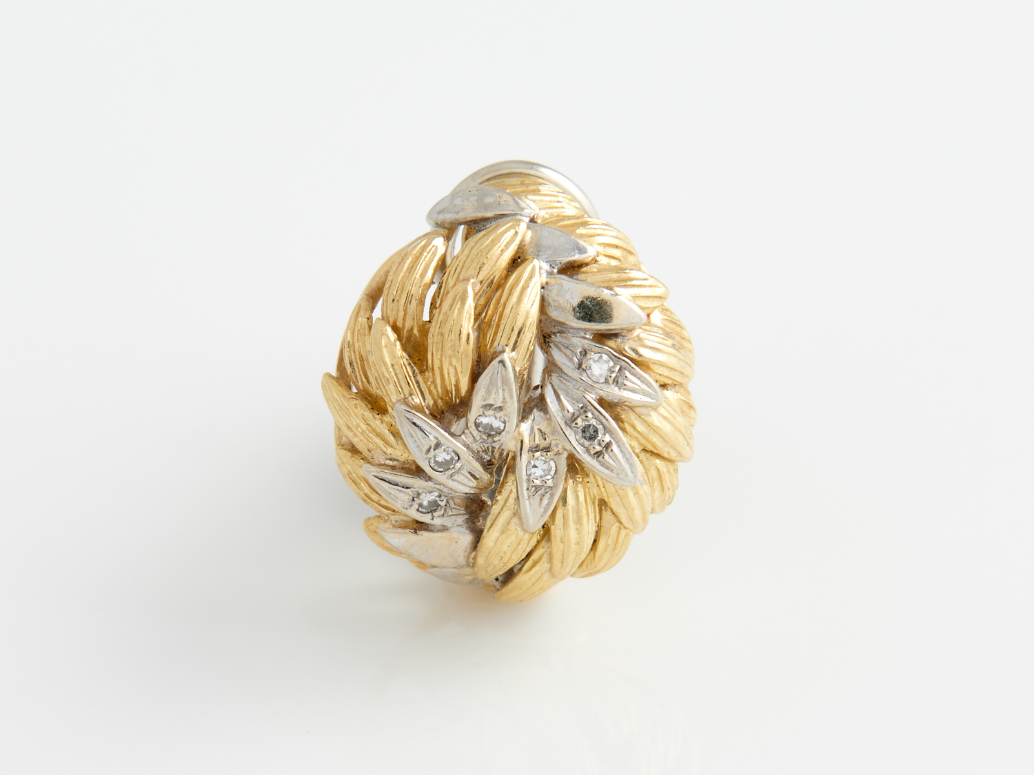 A DIAMOND SET EARRING IN 18CT TWO TONE GOLD, TO POST AND LEVER BACK FITTING, 9.0GMS