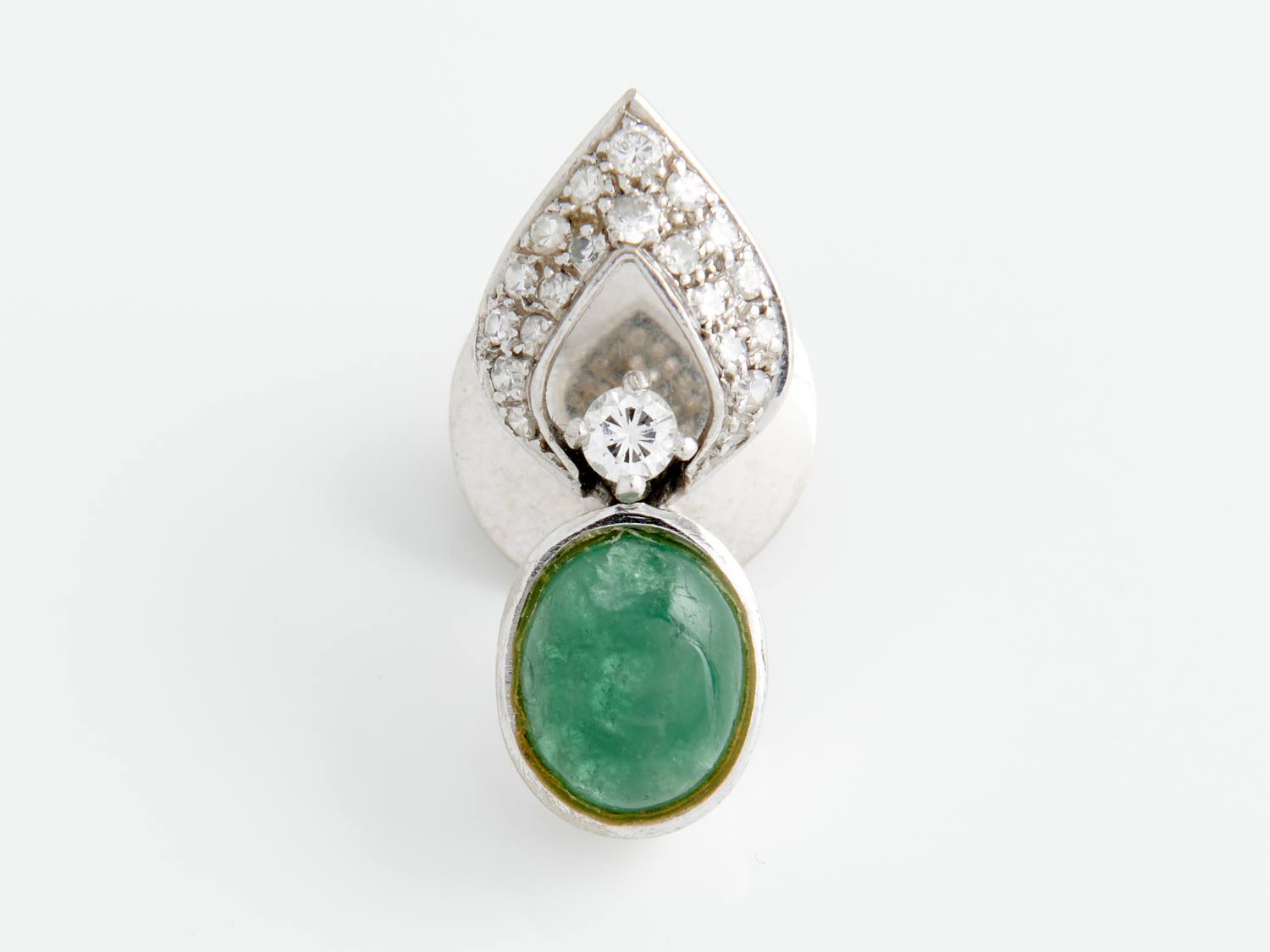 AN EMERALD AND DIAMOND EARRING IN 18CT GOLD, TO POST AND BUTTERFLY FITTING, THE EMERALD OF 2CTS, THE DIAMONDS TOTALLING 0.40CTS, 4.6GMS