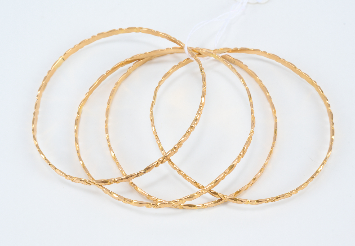 FOUR ENGRAVED BANGLES IN 18CT GOLD, 38.10GMS