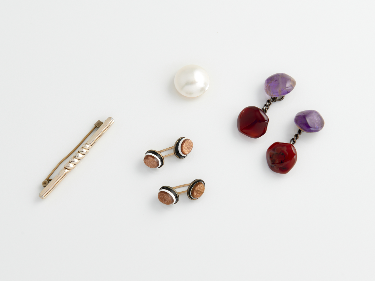 PAIR OF CARNELIAN AND AMETHYST CUFFLINKS AND A PAIR OF GOLDSTONE CUFFLINKS, TOGETHER WITH A BROOCH IN GOLD PLATE AND A LOOSE MABE PEARL