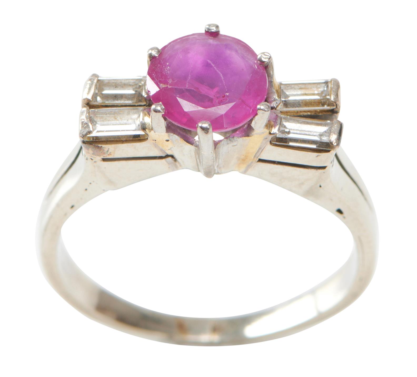 A RUBY AND DIAMOND RING IN 14CT WHITE GOLD, RING SIZE N, 4.2GMS