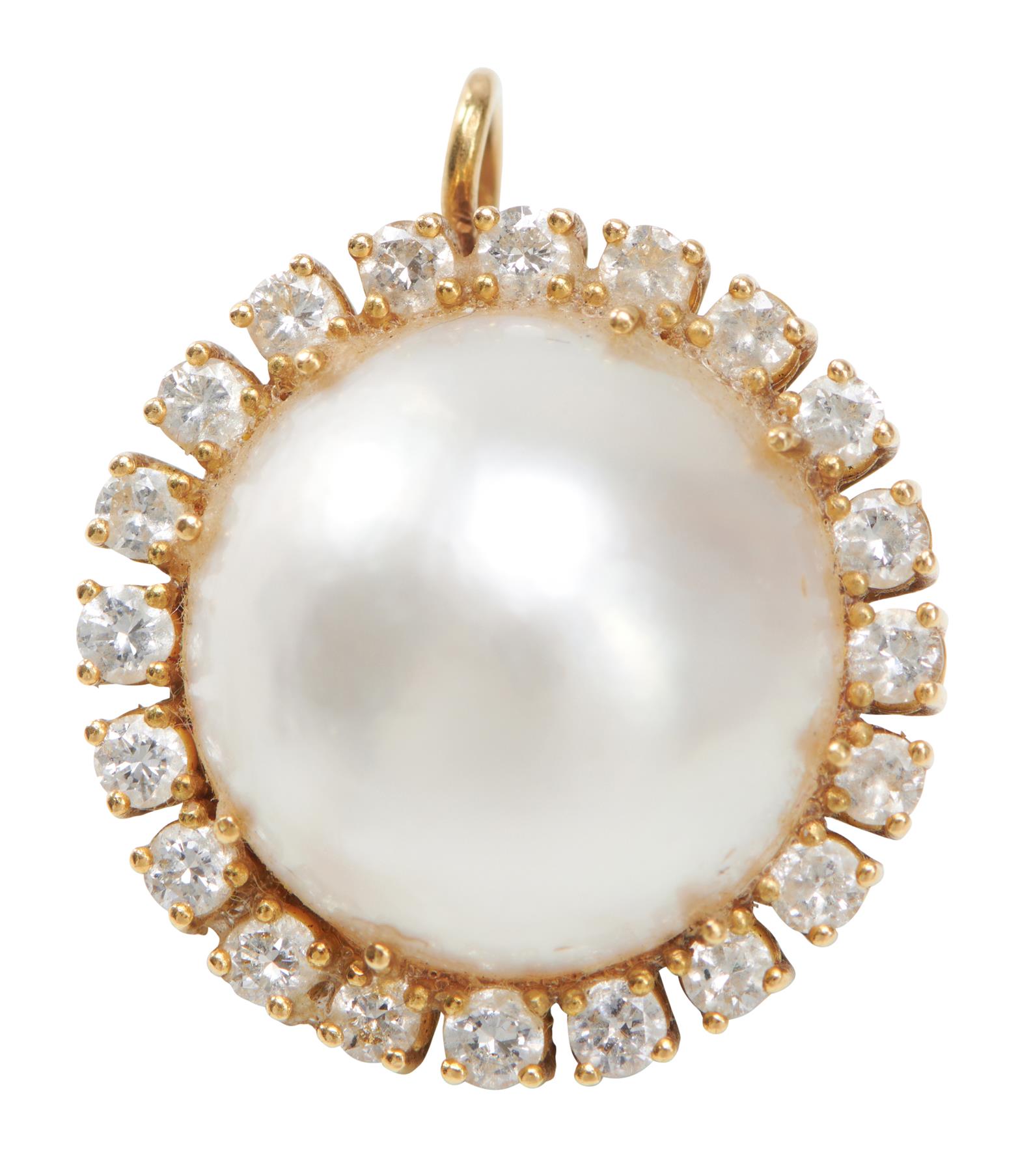 A MABE PEARL AND DIAMOND ENHANCER IN 14CT GOLD, THE DIAMONDS APPOXIMATELY 0.6CTS, 25MM DIAMETER, 8.4GMS