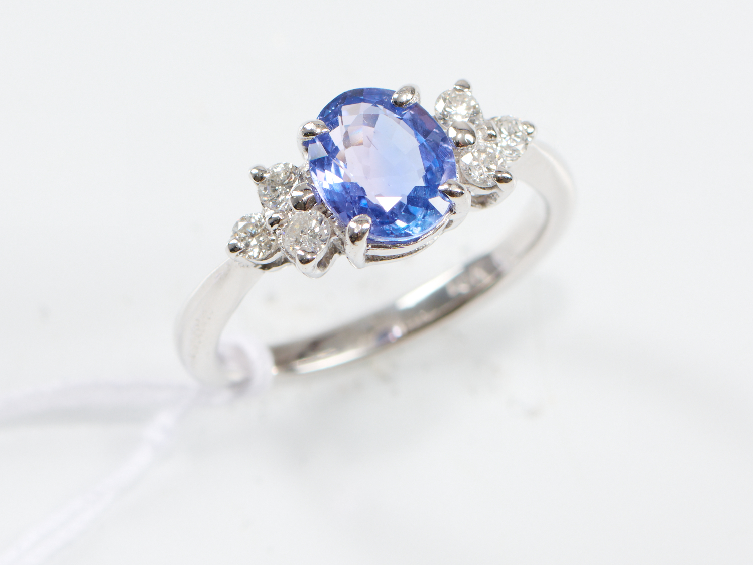 AN UNHEATED SAPPHIRE AND DIAMOND SET RING IN 18CT WHITE GOLD, FEATURING A CENTRAL OVAL CUT SRI LANKAN SAPPHIRE TOTALLING 1.51CTS (7.79 X 6.50 X 3.36MM), THE SHOULDERS SET WITH 6 ROUND BRILLIANT CUT DIAMONDS TOTALLING 0.20CTS (SI, G), RING SIZE L/M, WITH ACCOMPANYING AIG CERT AND VALUATION)