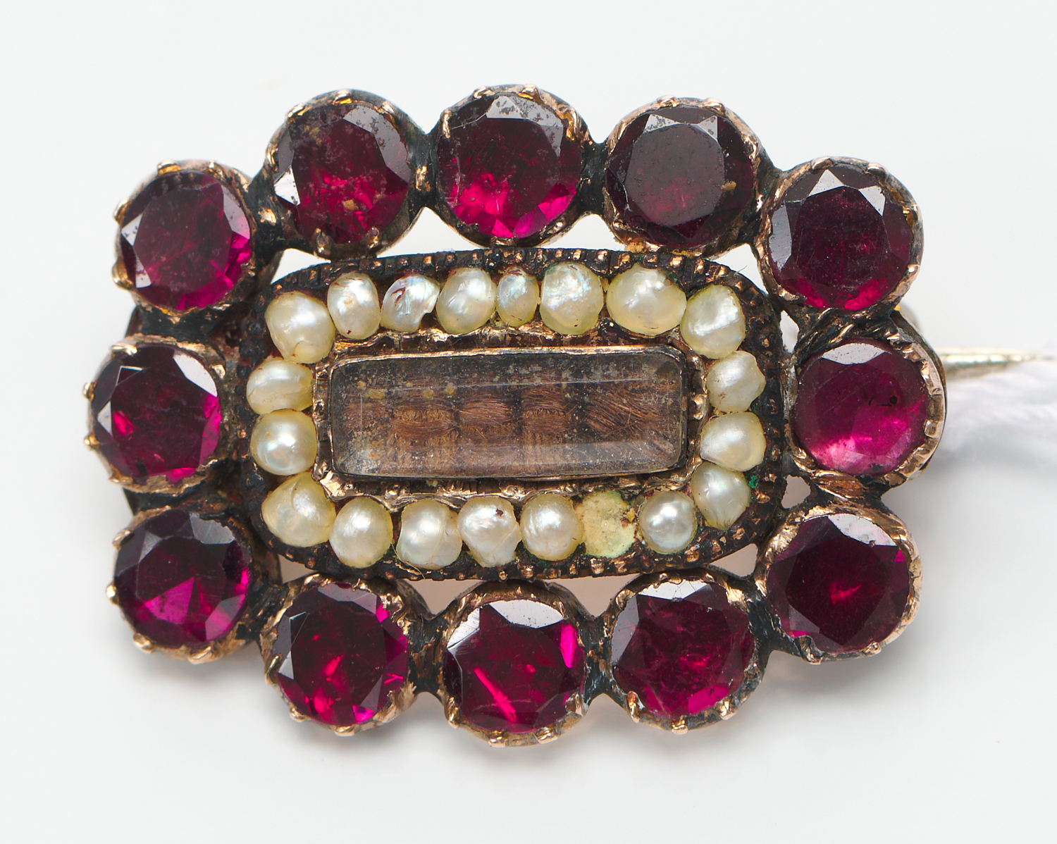 A GEORGIAN GARNET AND SEED PEARL MOURNING BROOCH IN GOLD PLATE
